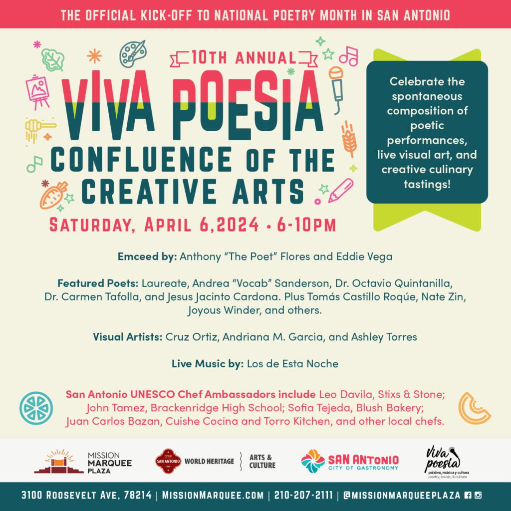 The City of San Antonio’s World Heritage Office and the Department of Arts & Culture present the 10th Annual Viva Poesía Festival at the historic Mission Marquee Plaza, 3100 Roosevelt Ave., on Saturday, April 6, 2024, from 6 -10 p.m. Three of San Antonio’s Poet Laureates, four San Antonio UNESCO Chef Ambassadors, three Visual Artists, and others will come together to create collaborative compositions through the power of creative expression. The event is free and open to the public.