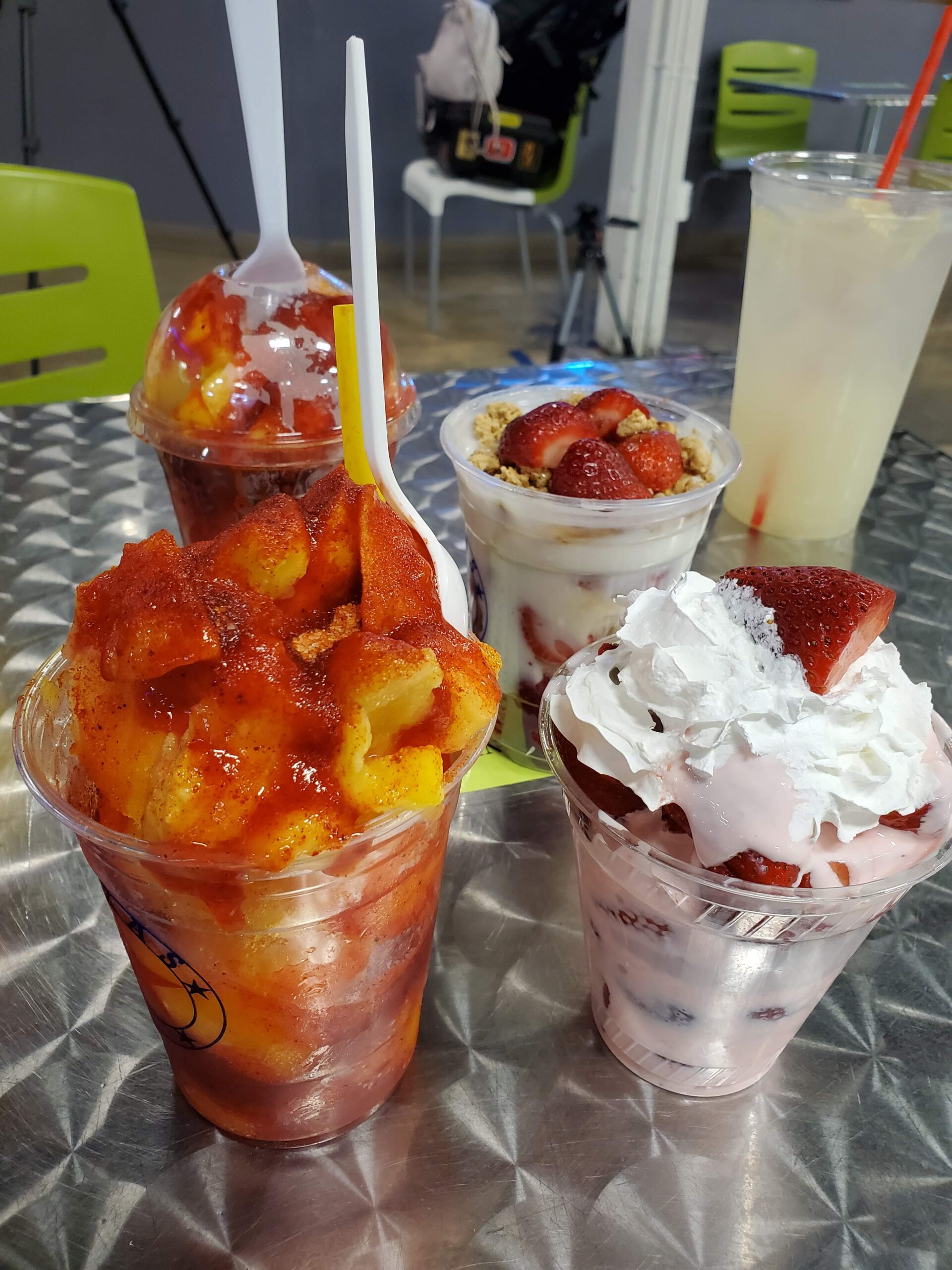 Manny’s Fruteria and Elotes Snack Shop is in center food court right up the main center isle as you walk into Pica Pica Plaza; the fruteria is on your right and the Elotes shop is to your left. Both snack shops have all the Southside favorites. On the Elotes Snack Shop side they have menu items such as corn in a cup, frito pie, hot Cheetos and cheese, burritos, funnel cake, and others. On the fruteria side, they make mangonadas, parfaits, fruit cups, aguas frescas, and more. You can have your lunch/dinner and dessert here (or to go).