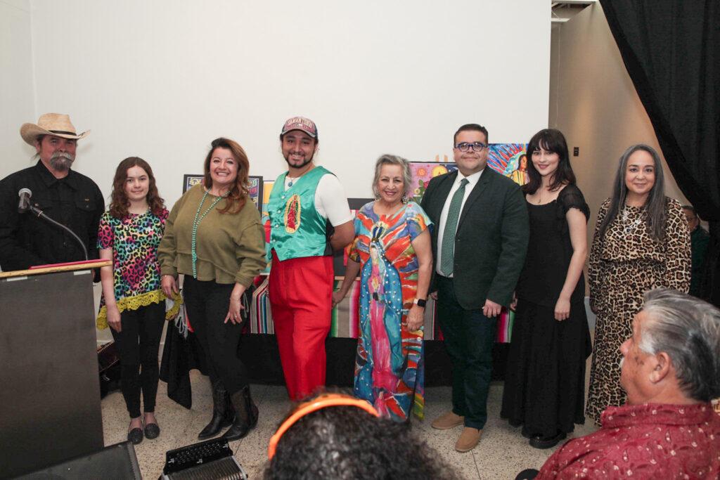 From left to right: Juan Tejeda, founder of Tejano Conjunto Festival; Lydia Ireland (Middle School 1st place winner); Micaela Sosa, daughter of TCF Poster Contest Winner Robert Sosa who was unable to attend; Roman Gonzales (College 1st place winner), Carolina Flores (Open category 1st place winner), Dr. Hector Garza (Open category, 2nd place winner); Monserrat Silva-Lopez (College Honorable mention) and Cristina Ballí, executive director of the Guadalupe Cultural Arts Center.