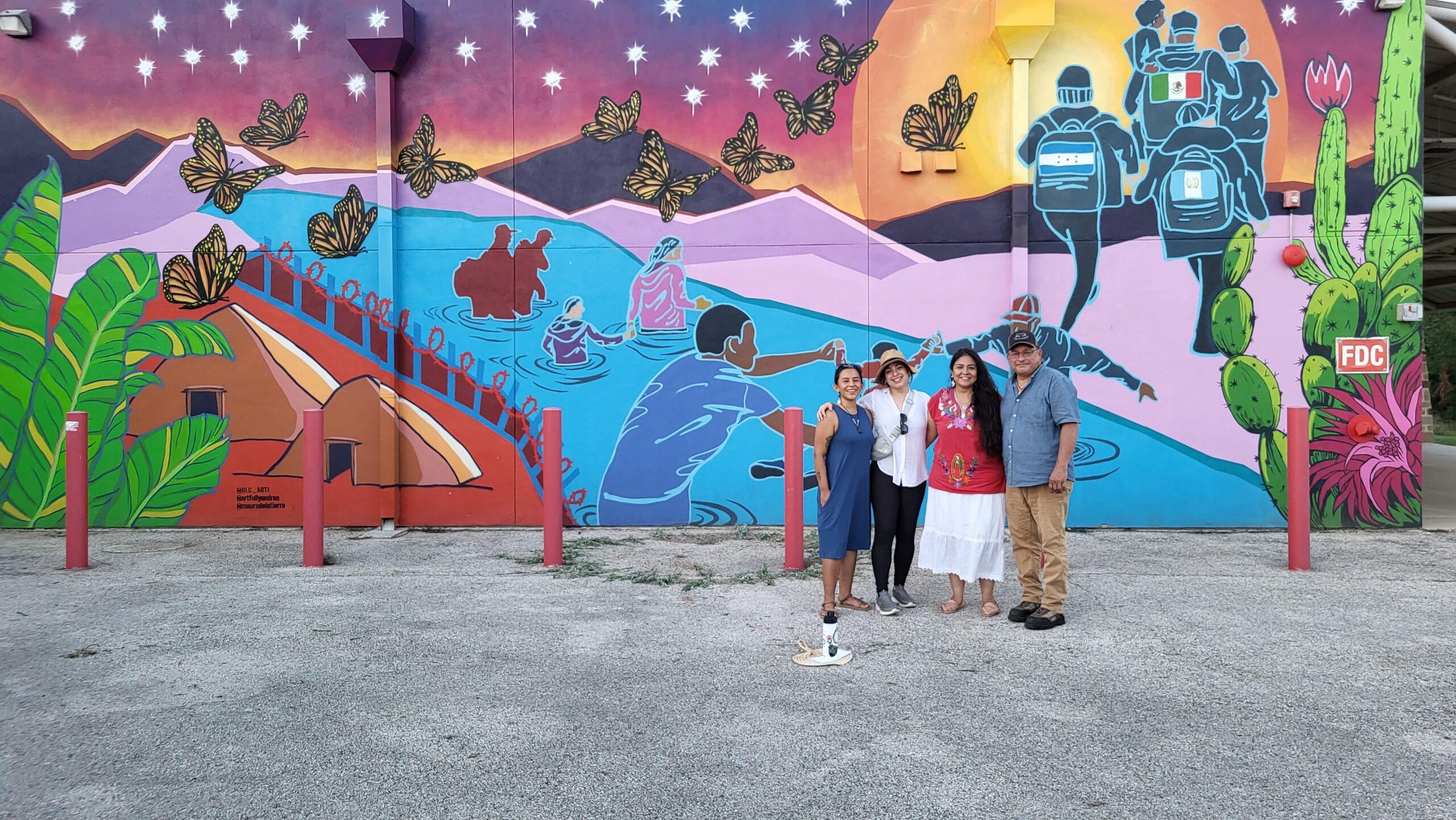 The mural depicts monarch butterflies hovering above migrant families who carry backpacks adorned with the flags of Mexico, Honduras, and Guatemala. These flags represent the countries where many of the tragedy’s victims originated. Monarch butterflies, known for their long migratory journeys, symbolize the resilience and hope of migrant families.