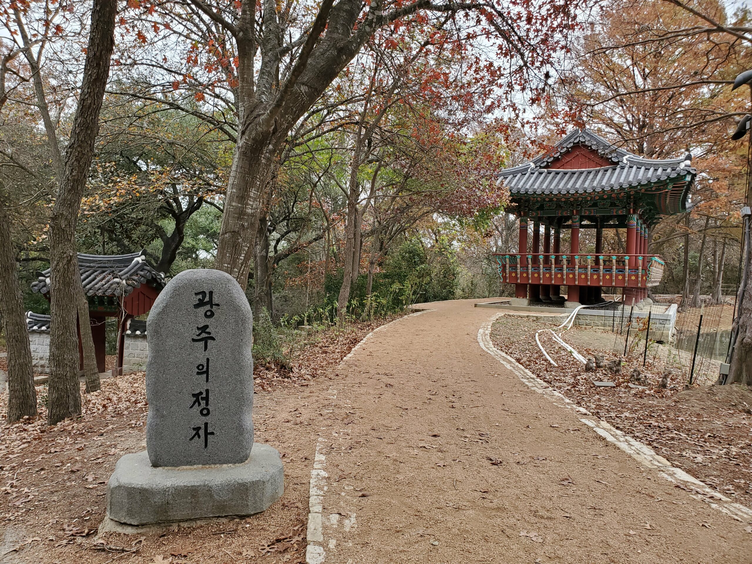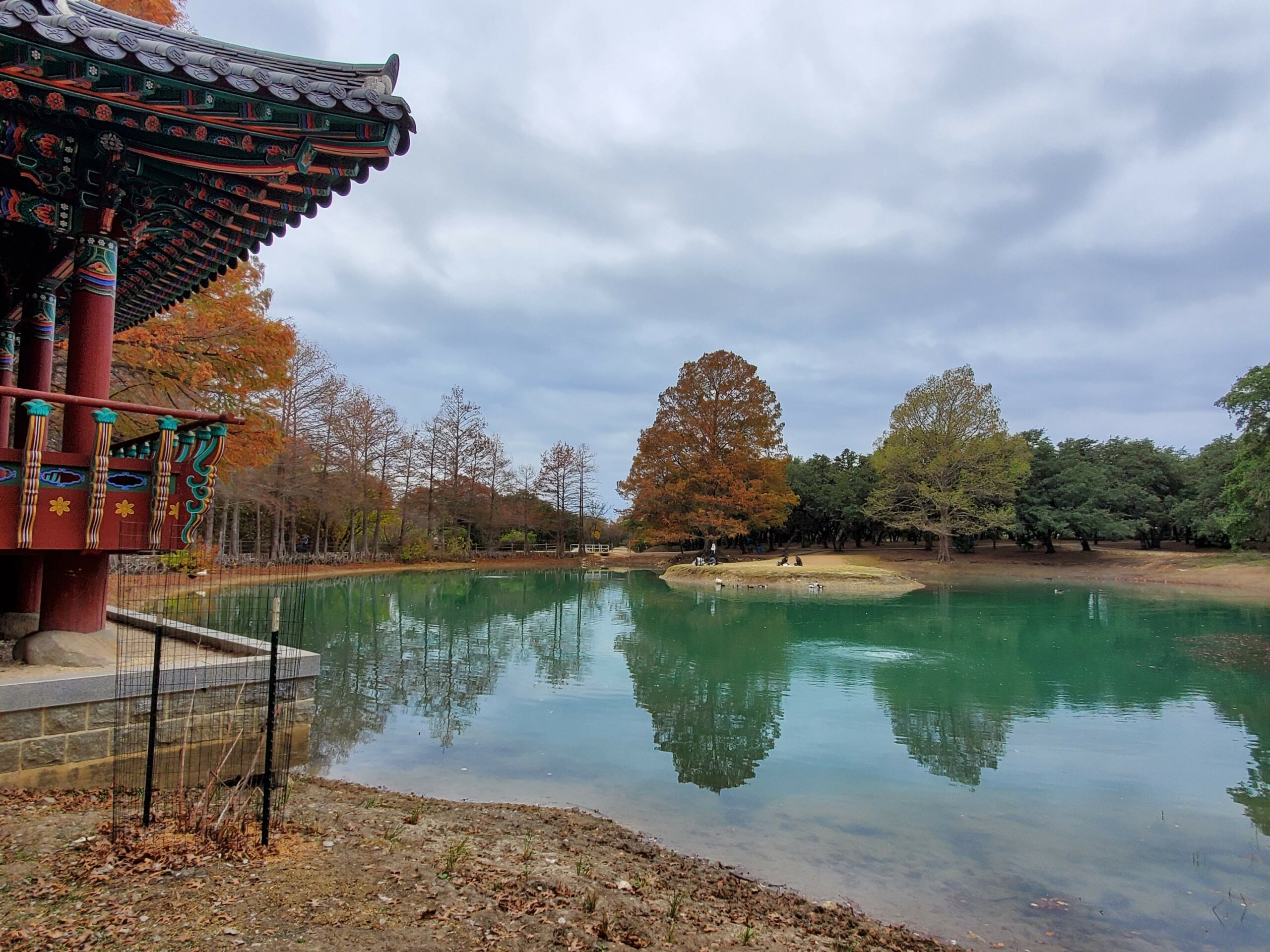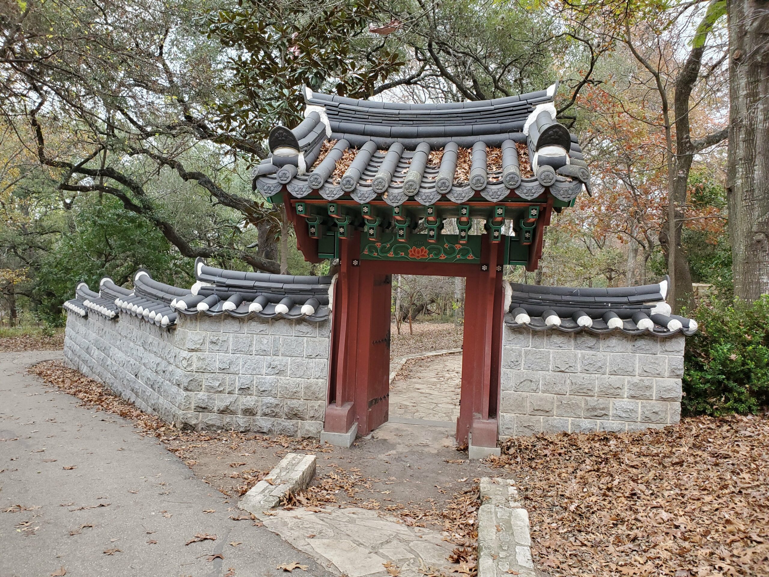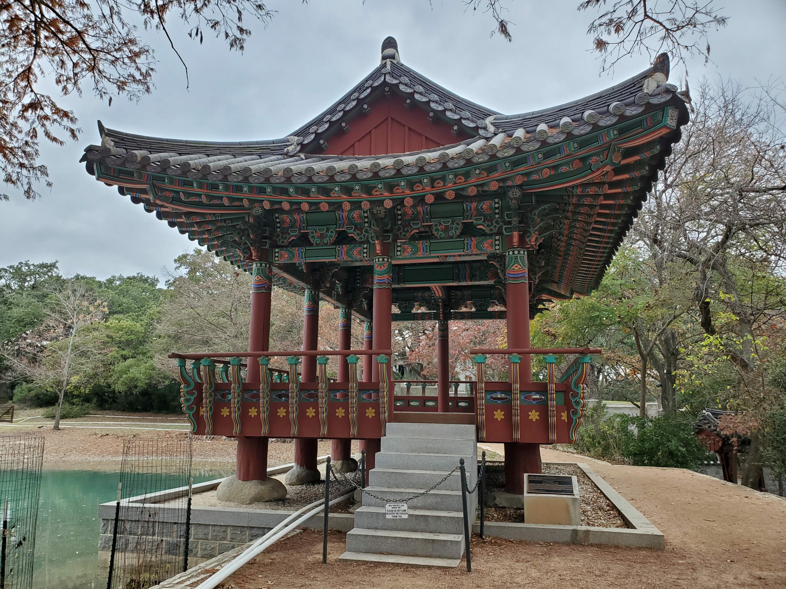 Denman Estate Park is full of trees, trails, has picnic tables to sit at, and a view of a hand-built Gwangju, Korean monument overlooking a pond. Korean craftsmen and artists traveled to San Antonio to assemble it.