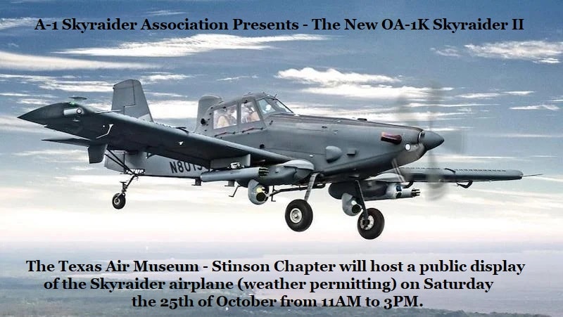 ? Exciting News! ? The national Skyraider Association is bringing an OA-1K Skyraider II aircraft to the Texas Air Museum – Stinson Chapter on 25 October 2025! ?✨ Join us for this amazing display (weather permitting) and experience aviation history up close! Don’t miss out! The Events starts at 11:00AM until 3:00PM on Saturday at 1234 99th Street, San Antonio, Texas 78214.