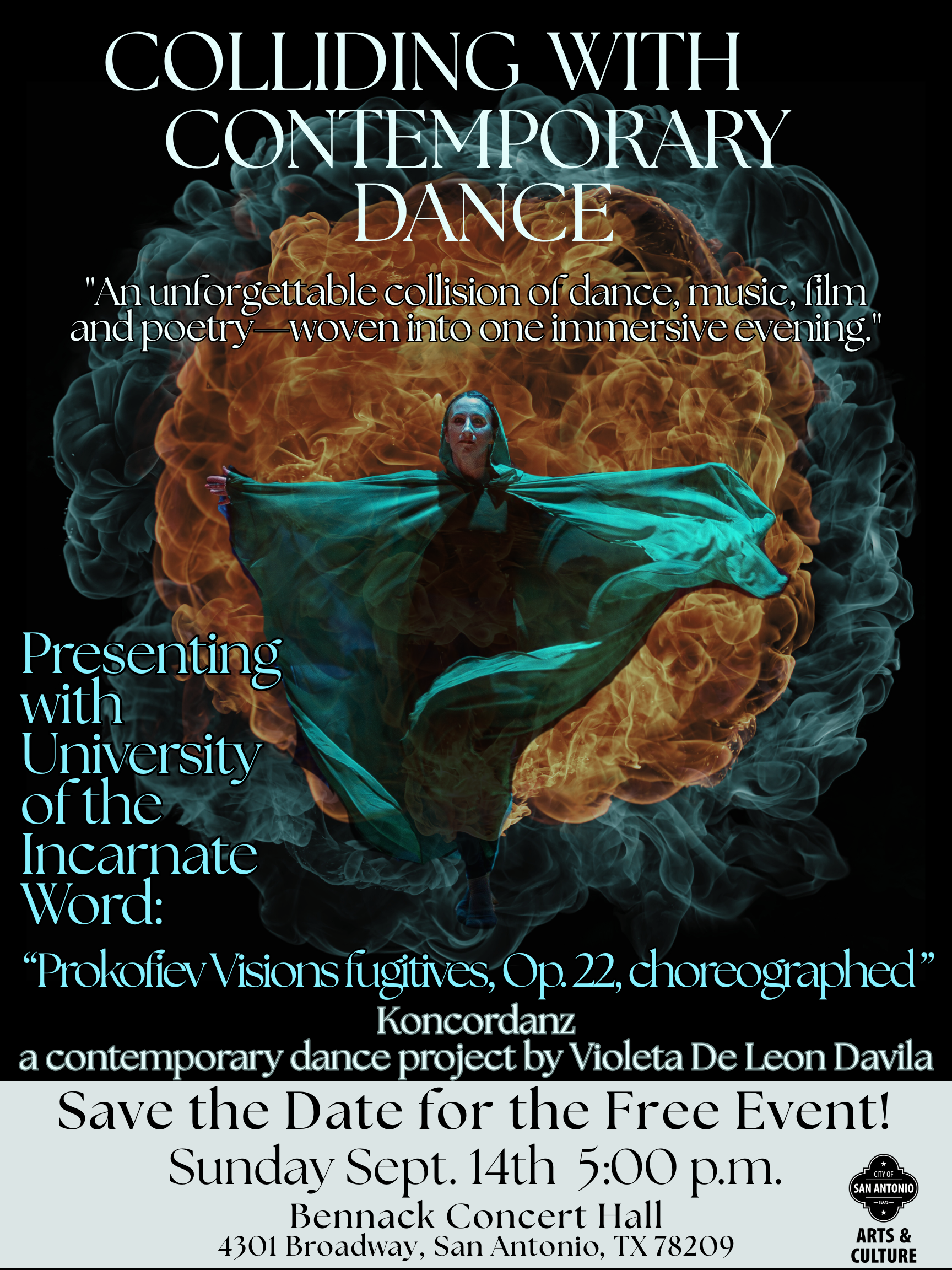 Colliding with Contemporary Dance presents a selection of choreographic works by Koncordanz, a contemporary dance project by Violeta De Leon Davila, featuring video-dance, live music, and spoken word poetry, with a special presentation of Prokofiev: Visions Fugitives, Op. 22, presenting with the University of the Incarnate Word.