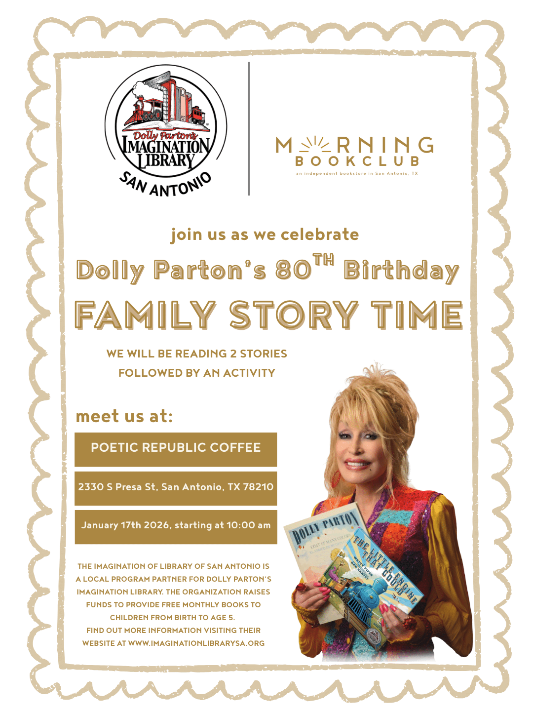 In celebration of Dolly Parton’s 80th birthday, join us for a Family Story Time. On Saturday, January 17, at Poetic Republic Coffee (2330 S. Presa St., 78210) at 10 a.m., Imagination Library of San Antonio and Morning Bookclub will host a Family Story Time. We’ll be reading two stories, and have a fun, colorful activity planned for the kids. We’ll be joined by special guest The 11th Hour Books.