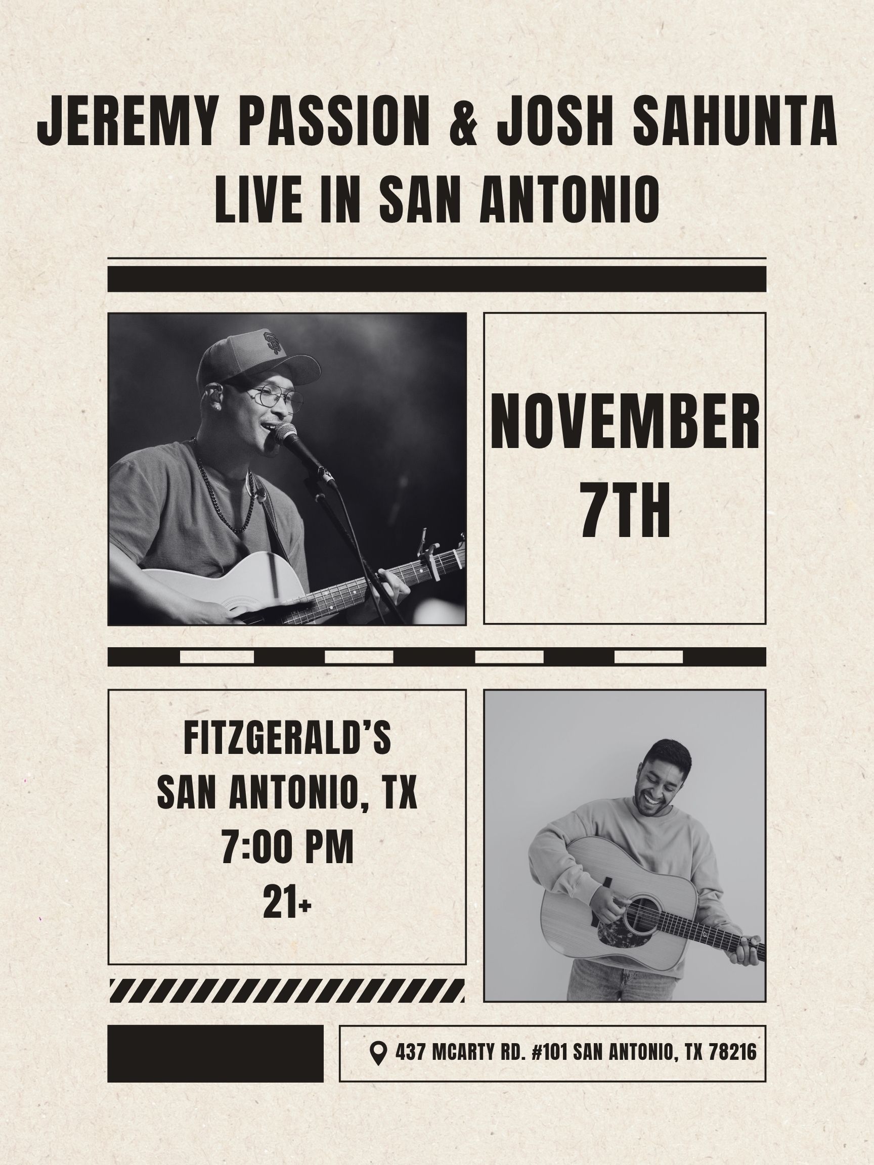 Experience a night of heart and soul when Josh Sahunta and Jeremy Passion bring their Texas tour to Fitzgerald’s in San Antonio.