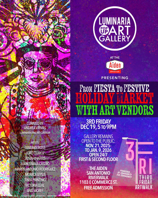 Join us for a festive evening on the 3rd Friday, December 19, from 5 pm to 9 pm! Luminaria is excited to host a special Holiday Market at the Luminaria Pop Up Art Gallery inside the Aiden Hotel River Walk. Discover unique, handcrafted art gifts from amazing local vendors—perfect for giving (or keeping!) this holiday season. Enjoy a cheerful atmosphere, connect with fellow art lovers, and make your holidays extra merry! Come in your fun holiday xmas sweaters and outfits!