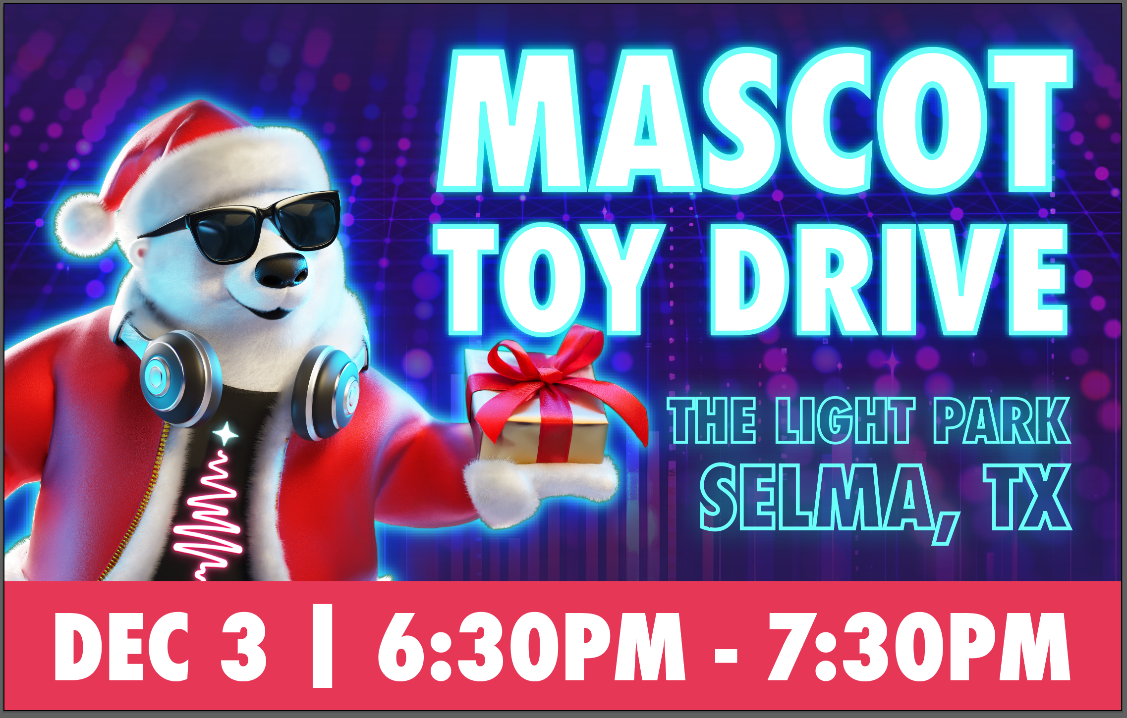 The Light Park San Antonio is hosting a Mascot Toy Drive on Wednesday, December 3, at its Selma location. Bring your ticket to the park and an unwrapped toy (in original packaging) to support school-age and teen patients at Christus Children’s Hospital.