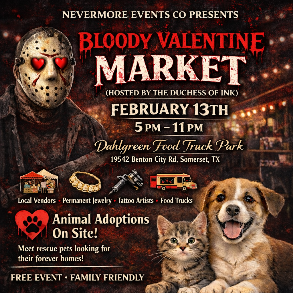 Join us for our Friday Night Market on February 13th from 5:00 PM to 11:00 PM at Dahlgreen Food Truck Park in Somerset, TX. This evening market features a curated lineup of local creators, crafters, tattoo artists, face painters, permanent jewelry vendors, and other small businesses.