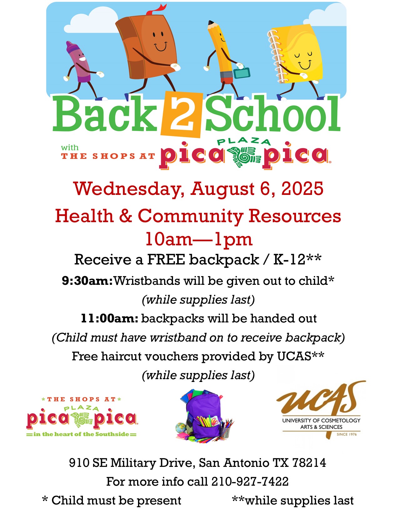 Free back to school event at PicaPica Plaza! Come out and check out community and parent resources.