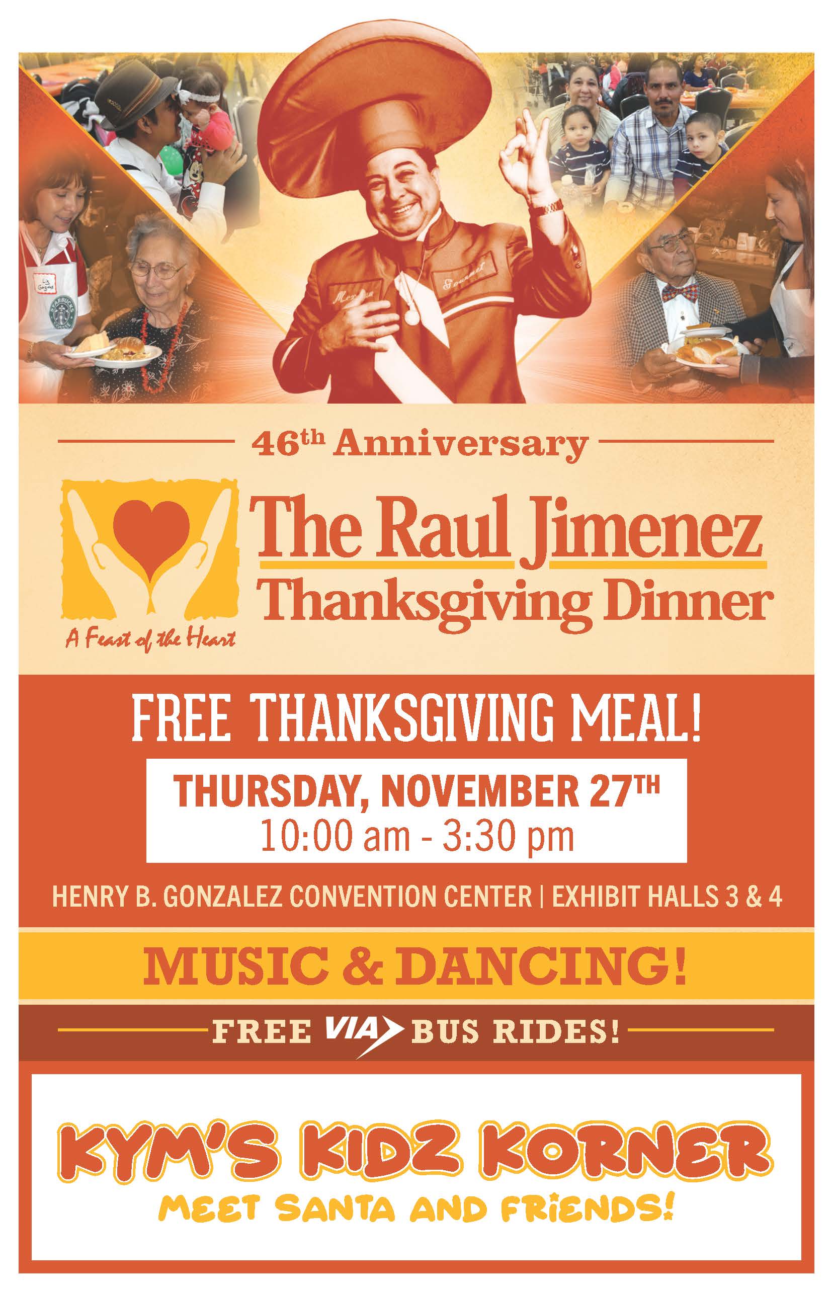 In 1979, San Antonio restaurant owner and businessman Raul Jimenez recognized a need in his community and established a Thanksgiving Day event designed to serve senior citizens and the less fortunate. Now in its 46th year, the Raul Jimenez Thanksgiving Dinner continues to provide senior citizens and the less fortunate a place to enjoy a hot and nutritious turkey dinner with all the trimmings on Thanksgiving Day.