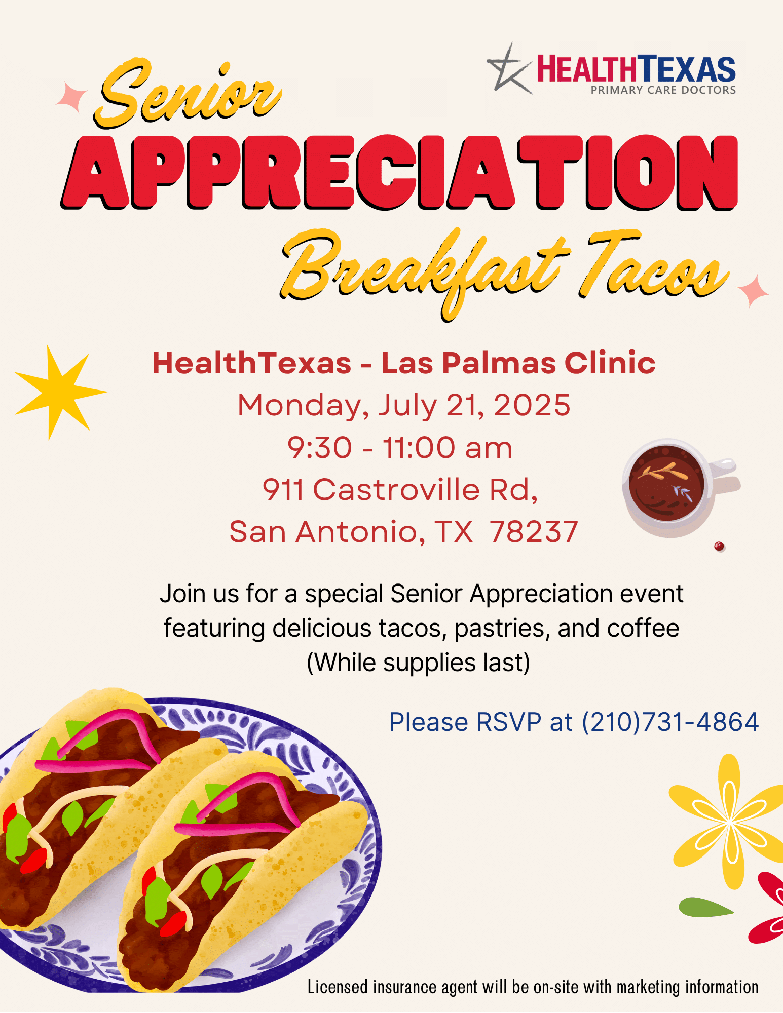 Join us at the HealthTexas – Las Palmas Clinic on Monday, July 21, 2025, from 9:30 to 11:00 AM for our Senior Appreciation event! Enjoy a delicious spread of breakfast tacos, fresh pastries, and hot coffee—all while supplies last. It’s a fun and friendly way to connect with others in the community and learn more about your healthcare options, with a licensed insurance agent available on-site to provide helpful information. Don’t forget to RSVP by calling (210) 731-4864—we look forward to seeing you there!