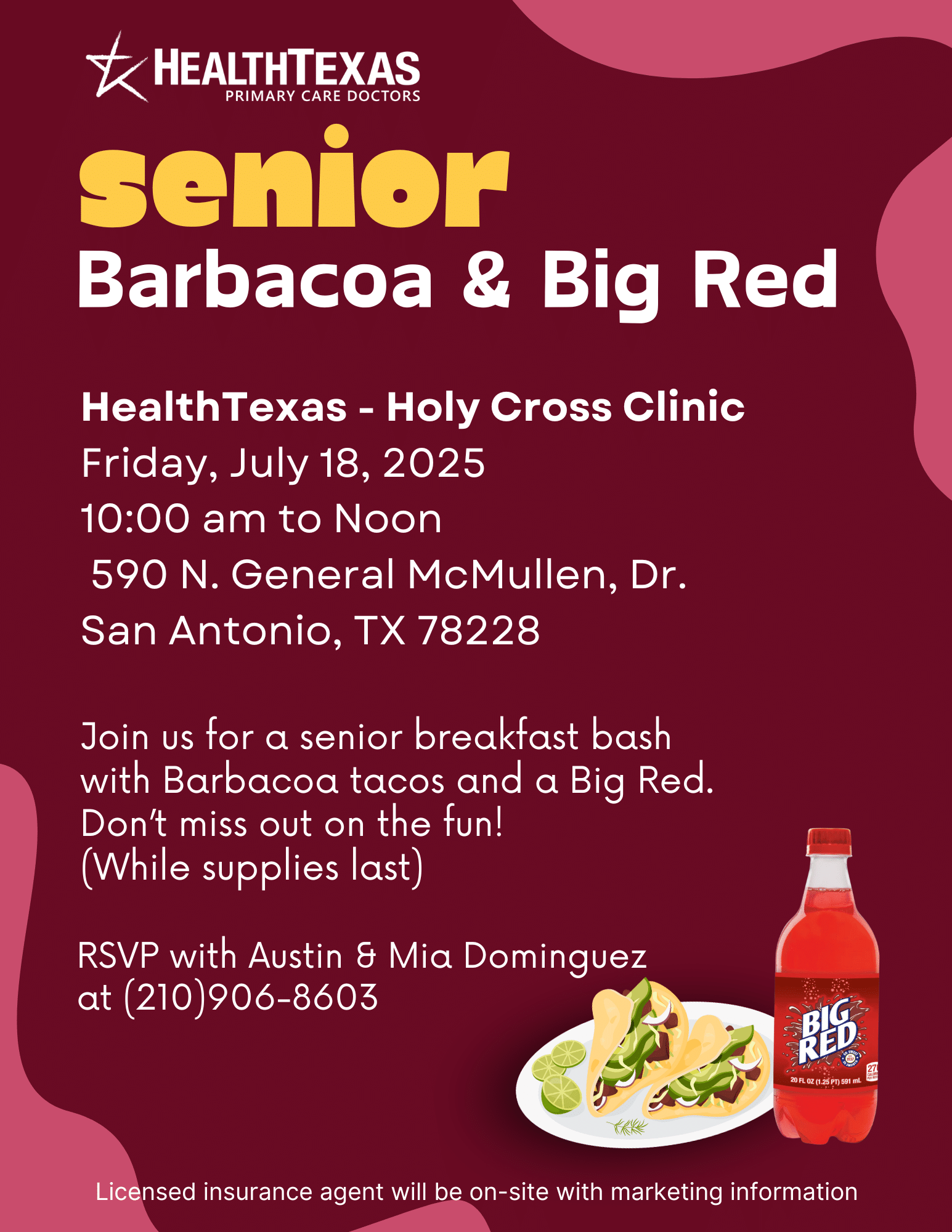 Join us for a sizzling good time at the Senior Barbacoa & Big Red Bash, hosted by HealthTexas at the Holy Cross Clinic on Friday, July 18, 2025, from 10:00 AM to Noon! We’re serving up San Antonio’s favorite breakfast combo, barbacoa tacos and ice-cold Big Red, along with great company and fun surprises. This free event is a perfect way to connect with the community and enjoy a delicious morning treat (while supplies last). Plus, a licensed insurance agent will be on-site with helpful healthcare information. Don’t miss out on the fun—bring a friend and RSVP today by calling Austin & Mia Dominguez at (210) 906-8603!