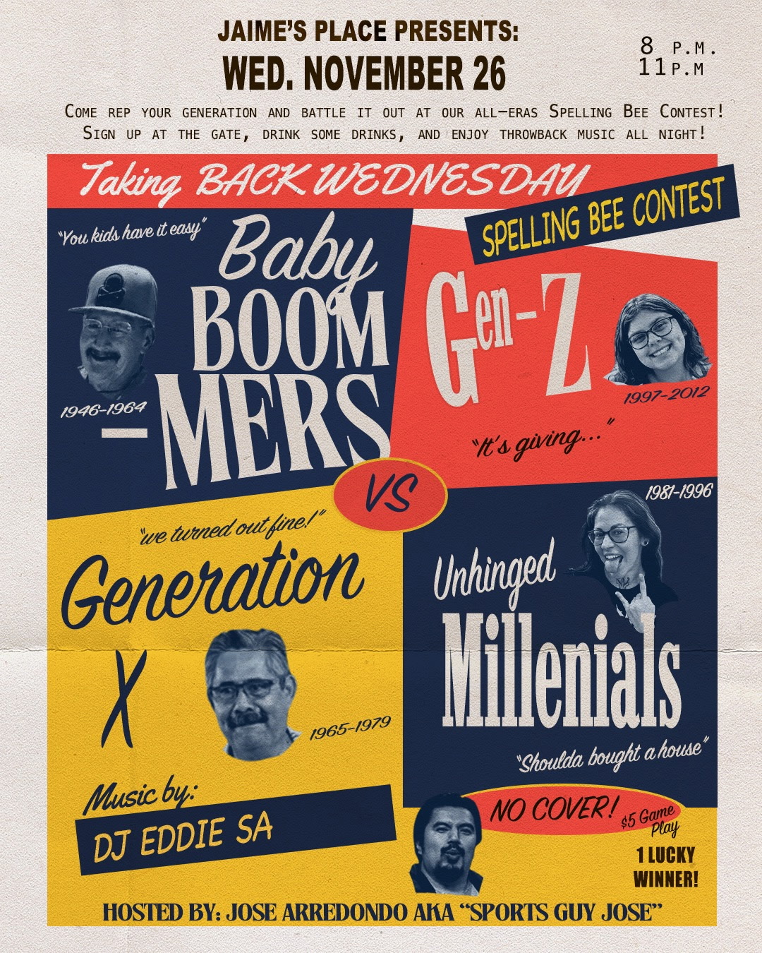 CALLING ALL BOOMERS, GEN X-ers, MILLENNIALS & GEN-Z!! Come rep your generation at our all-eras pre-thanksgiving Spelling Bee Contest: