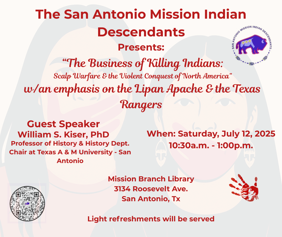 Join the San Antonio Mission Indian Descendants as we welcome Dr. William Kiser, author of “The Business of Killing Indians: Scalp Warfare & the Violent Conquest of North America. He will be concentrating on the Lipan Apache and the Texas Rangers for this presentation.