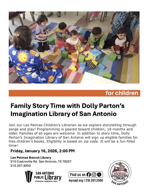 On Friday, January 16, at Las Palmas Branch Library (515 Castroville Rd. San Antonio, TX 78237) at 2 p.m., we’ll be co-hosting a Toddler Storytime in celebration of Dolly Parton’s 80th birthday. Join Las Palmas Children’s Librarian as we explore storytelling through songs and play! Programming is geared toward children, 18 months and older. Families of all ages are welcome. In addition to story time, ILSA will sign up families who reside in our eligible zip codes for free children’s books. It will be a fun-filled time!