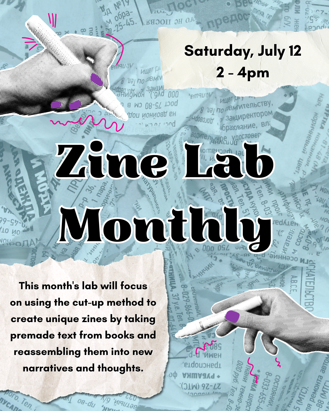 This month’s lab will focus on using the cut-up method to create unique zines by taking premade text from books and reassembling them into new narratives and thoughts. The method (or technique) first introduced through the Dadaist Art Movement and then later used by William S. Burroughs (and company) in the works of The Soft Machine, The Ticket That Exploded, and Nova Express. We invite you to this lab to explore and see where random juxtaposition of text might reveal something more.
