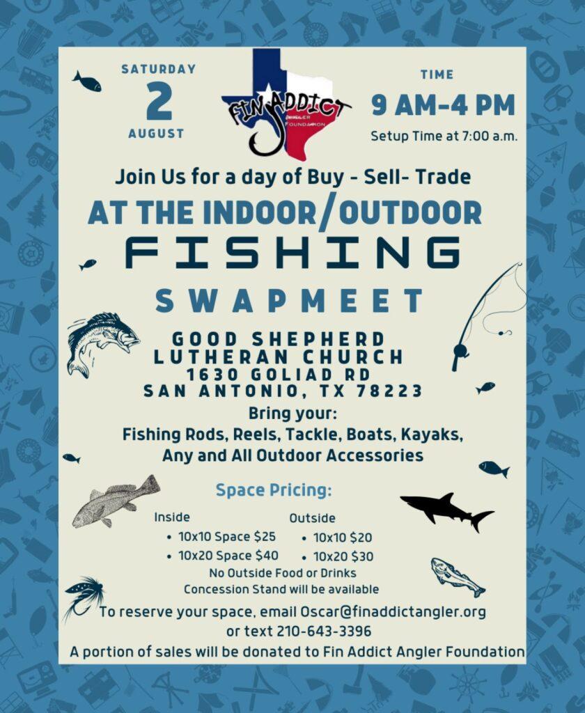 Outdoor lovers and anglers—mark your calendars! The first-ever Fin Addict Angler Foundation Fishing Swapmeet is on Saturday, August 2, 2024, from 9:00 a.m. to 4:00 p.m. at Good Shepherd Lutheran Church, located at 1630 Goliad Rd, San Antonio, TX 78223.