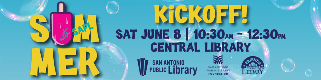 Kickoff Event at Central Library – Saturday, June 8, from 10:30 a.m. – 12:30 p.m. at Central Library for the Summer with SAPL kickoff. Enjoy a scavenger hunt, meet SAPL’s mascot, Smarty, and learn about summer programs. Free paletas for the first 250 guests!
