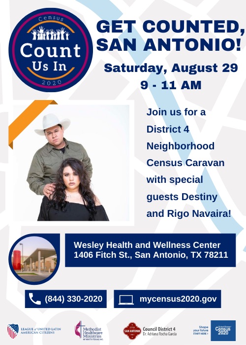 Councilwoman Dr. Adriana Rocha Garcia and the San Antonio Bexar County Complete Count Committee will partner with Methodist Healthcare Ministries, League of United Latin American Citizens District 15, and the U.S. Census Burea for the District 4 Neighborhood Census Caravan. Several community and civic organizations and special guests, Destiny and Rigo Navaira, will participate in this event to help promote participation in the Census 2020.