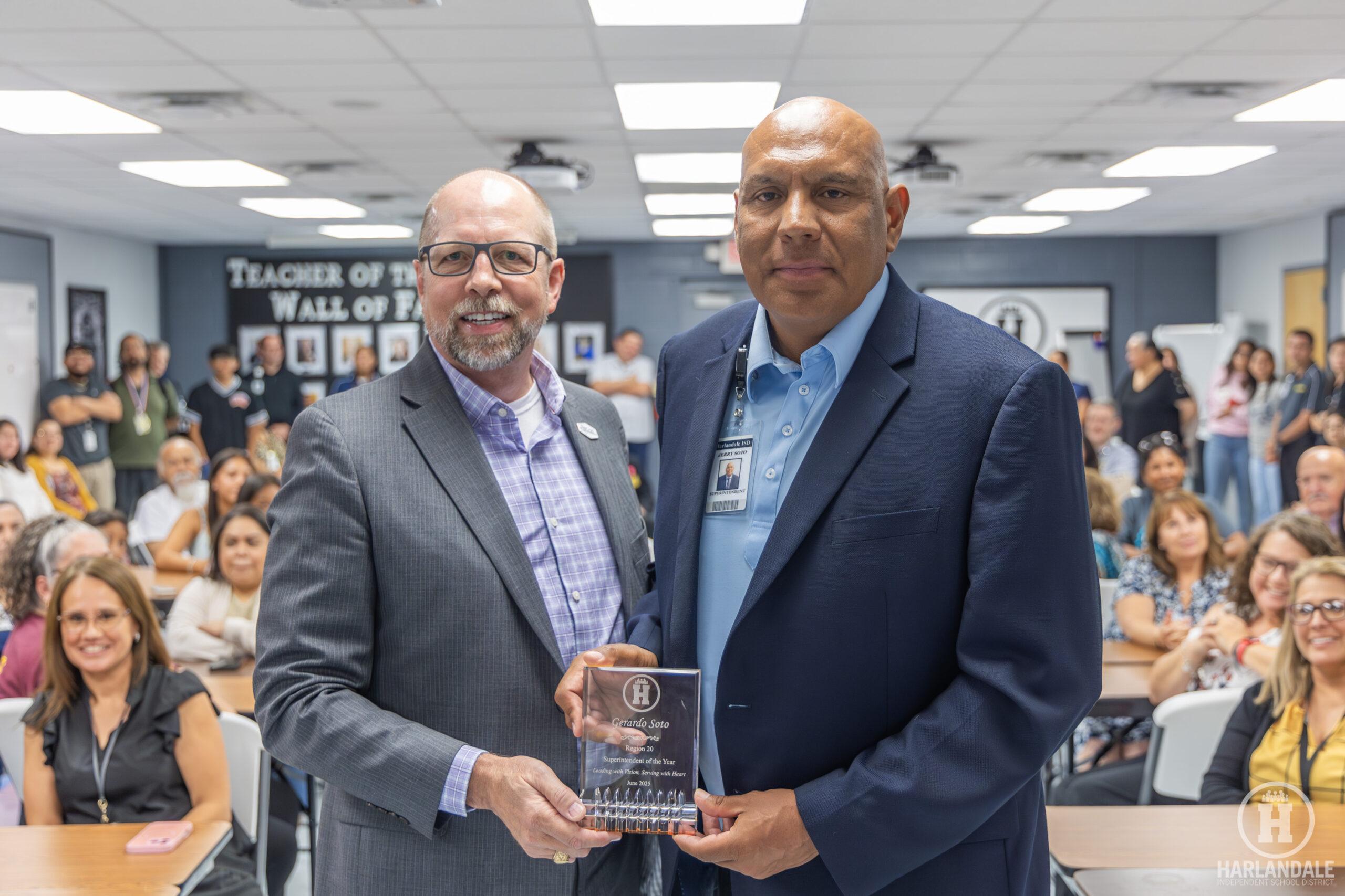 The surprise announcement was made by Education Service Center Region 20 Executive Director Dr. Jeff Goldhorn, with Harlandale Board Trustees, district leaders, and Mr. Soto’s family in attendance. As Region 20’s honoree, Mr. Soto will now represent the region in the fall statewide competition at the 2025 TASA/TASB Convention.