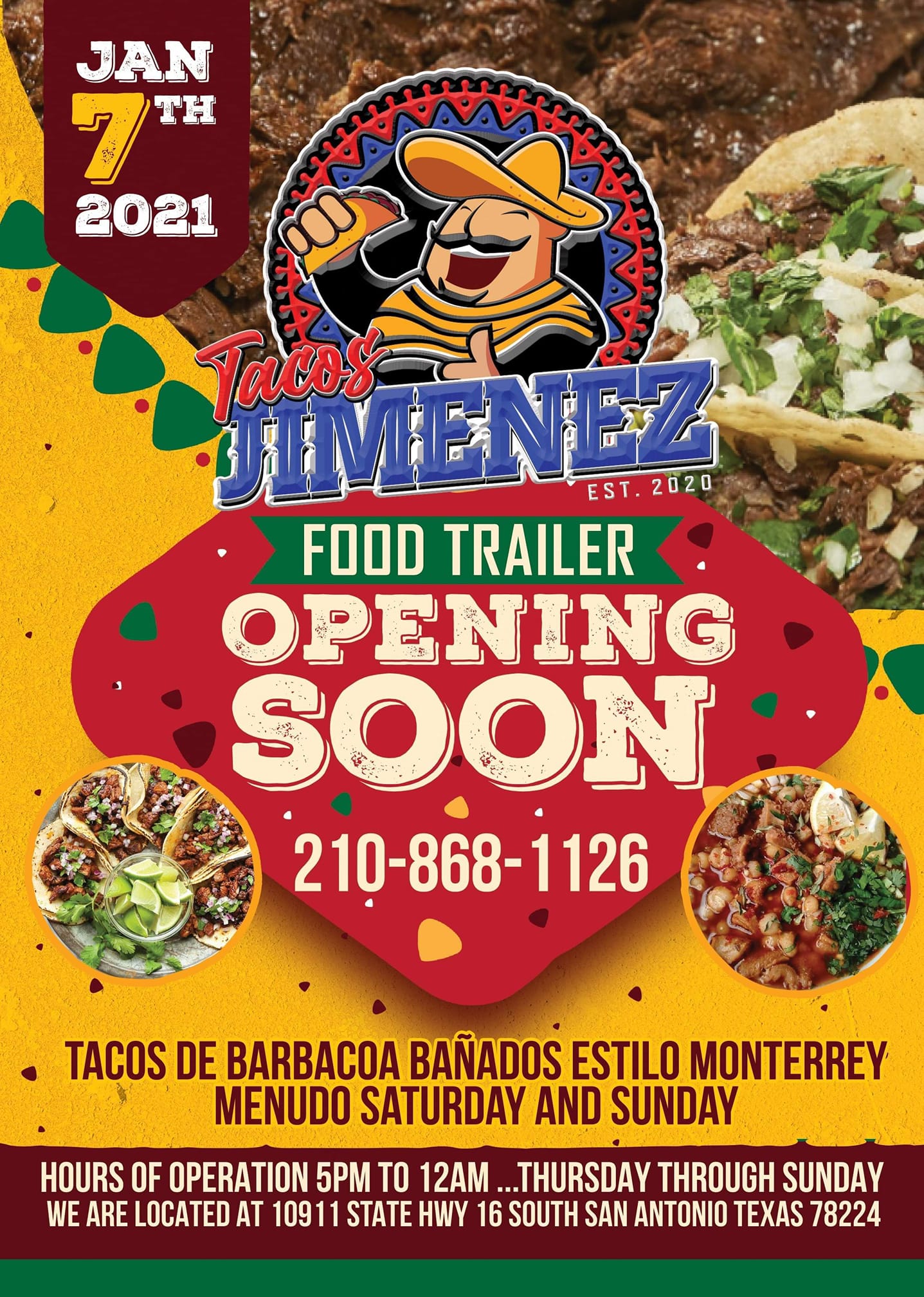 Tacos Jimenez will specialize in traditional Mexican food from Monterey as a tribute to his mother Adela Jimenez who has roots there. Endeared staples such as Menudo, will be served on the weekends along with their specialty, banado barbacoa tacos.