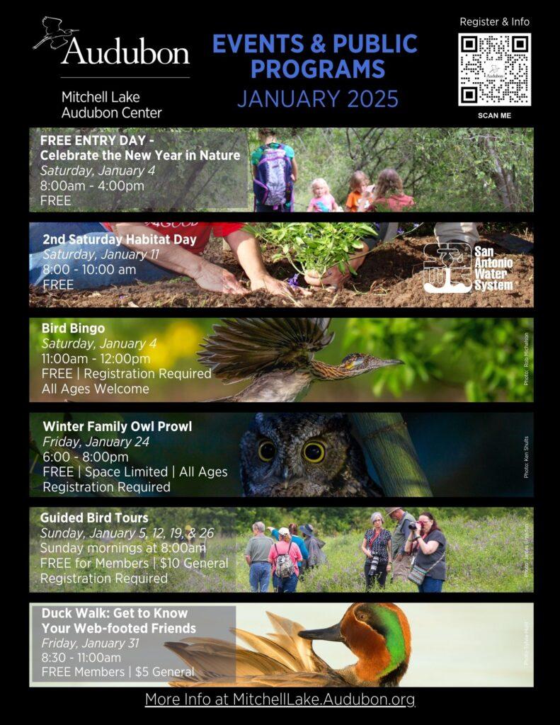 Welcome the New Year by immersing yourself in the beauty of nature and the fascinating world of birds at Mitchell Lake Audubon Center. This January, Mitchell Lake Audubon Center offers various programs designed to engage, educate, and inspire visitors of all ages. Whether you’re a seasoned birder or just starting your journey, there’s something for everyone.