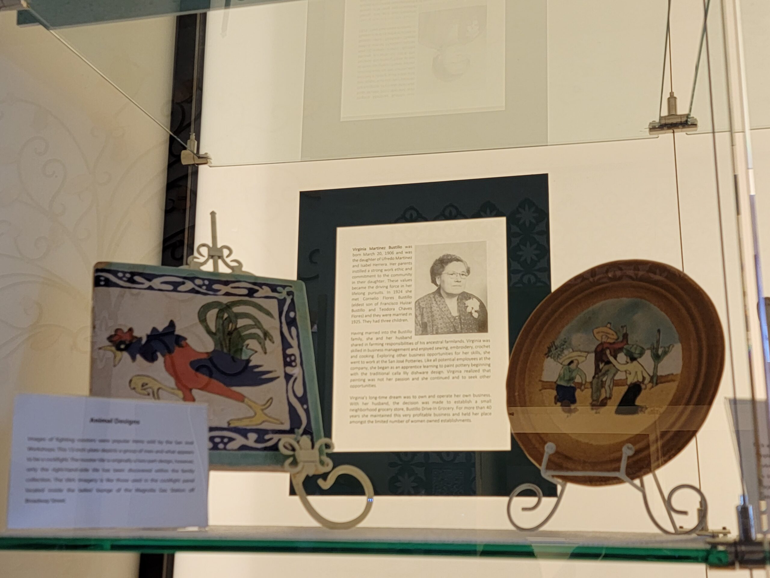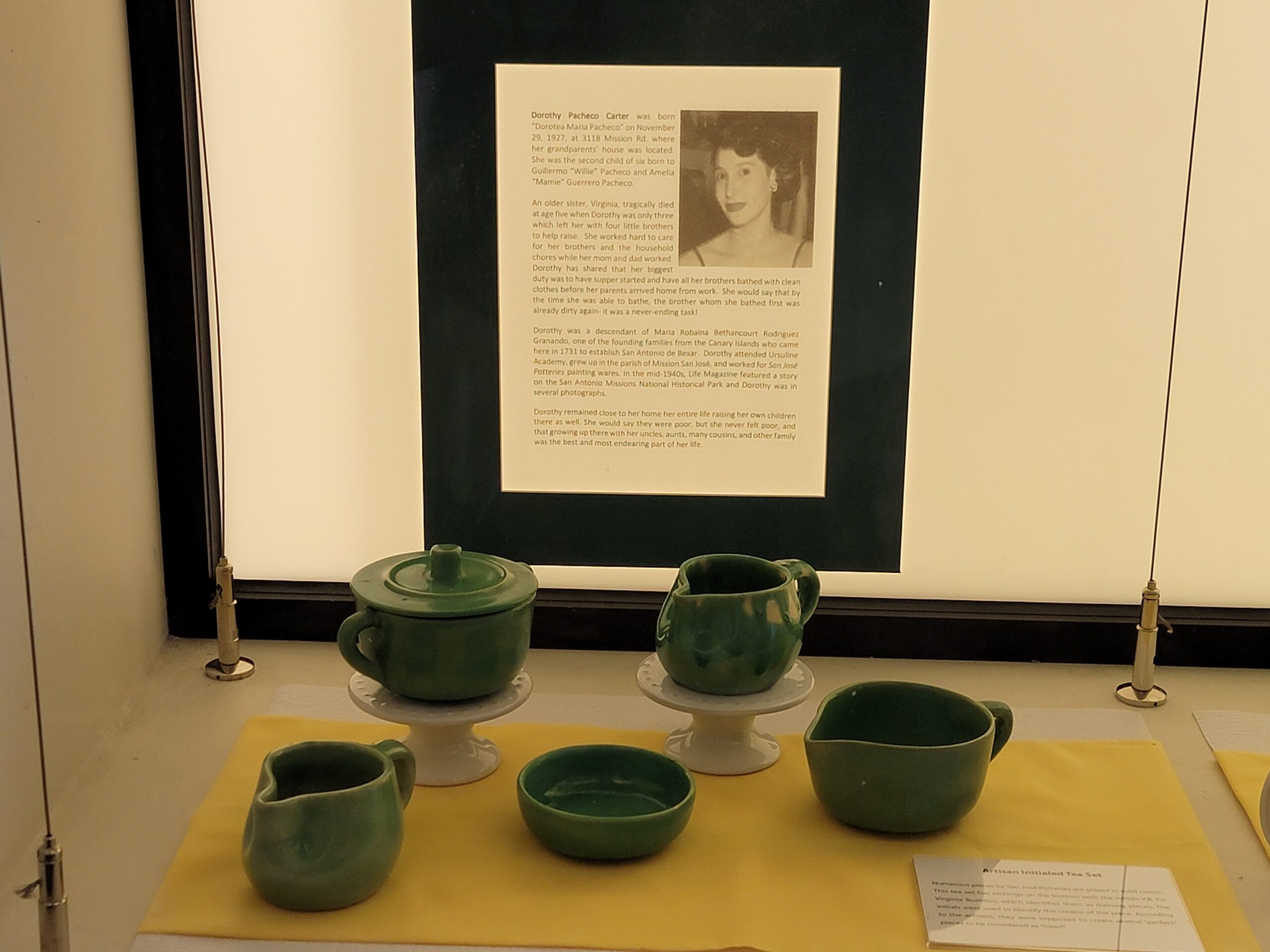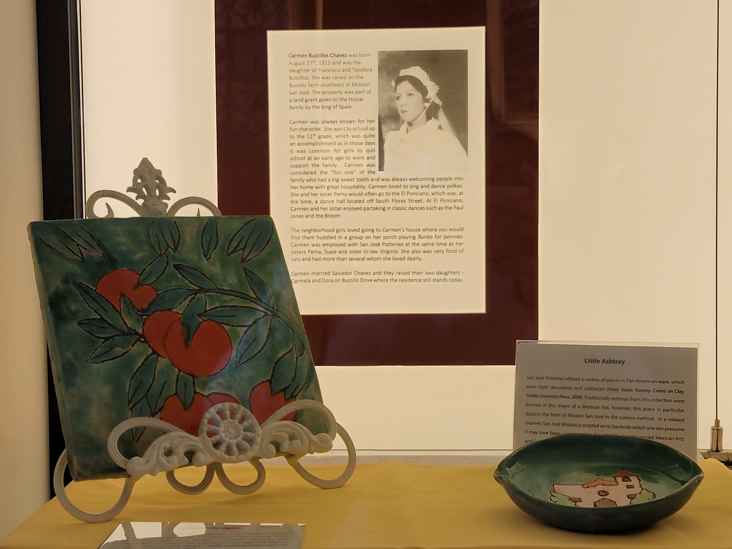 Visitors are offered an intimate glimpse into the lives of artisans like Jesusa (Susie) Bustillos-Chavez, Maria Eufemia (Pema) Bustillos-Salinas, Carmen Bustillos-Chavez, Virginia Martinez- Bustillos, Dorothy Pacheco, and Emma Vignes-Dixon through a private compilation of photographs, heirlooms and hand-crafted creations as well as original furniture productions from San José Potteries. These precious items are generously loaned to the Mission Library from the personal collections of Susan Toomey Frost and the Anguiano, Mendoza, Bustillos, Salinas, Valdez, and Villarreal families.