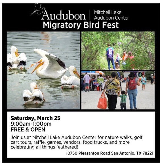 Mitchell Lake Audubon Center is excited to bring back Migratory Bird Fest as we celebrate spring migration with a free, family-friendly community festival. This annual event will take place on Saturday, March 25 from 9:00 am to 1:00 pm and is a free community festival filled with animal ambassador friends, birdhouse-building with Home Depot, games, crafts, vendors, native plant sale by Pollinatives, food trucks, nature walks, and golf cart tours of the wetland areas. A live bird show by raptor rescue Last Chance Forever will occur at 11:30.