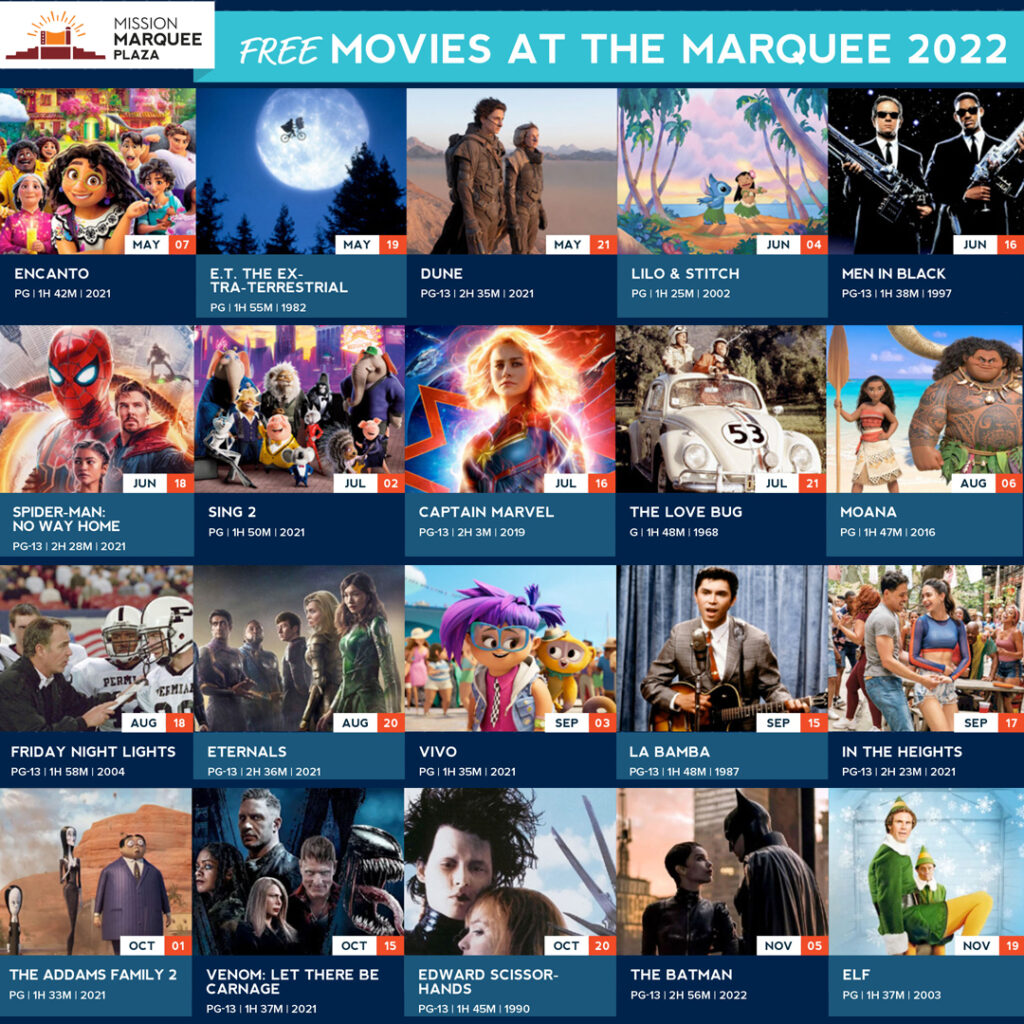 Some of the movies scheduled for this season are “E.T. The Extra-Terrestrial” on Thursday, May 19; “Men in Black” on Thursday, June 16; a 35th anniversary celebration of “La Bamba” on Thursday, September 15; “The Batman” on Saturday, November 5; and others. The 2022 Outdoor Family Film Series selections include recommendations by the community collected through an open call via social media at the beginning of the year. The full schedule is available at www.missionmarquee.com.
