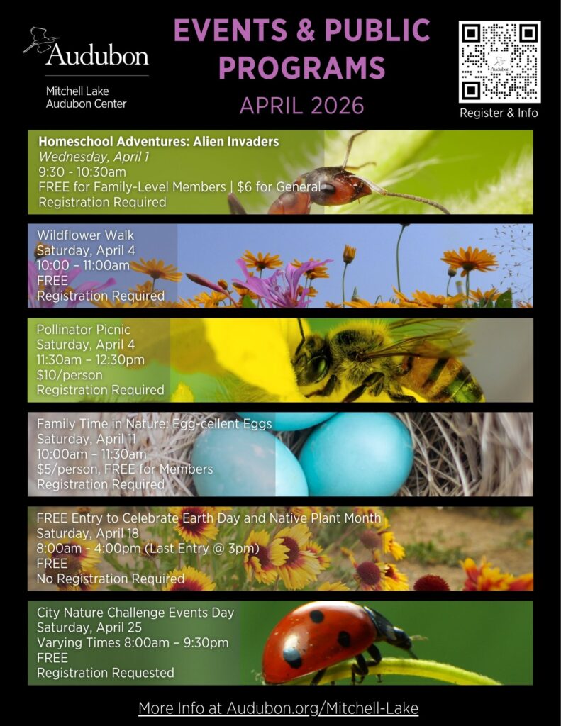 Unless otherwise noted, registration for events is available at MitchellLake.Audubon.org/events.