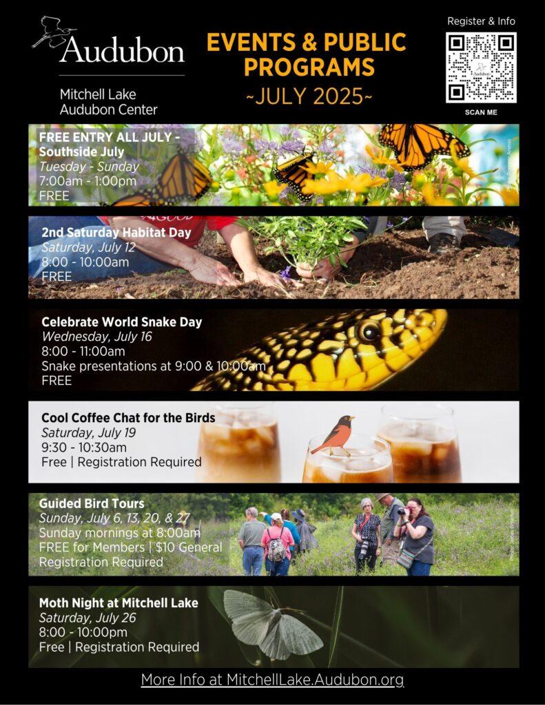 July is the perfect month to explore nature, connect with wildlife, and enjoy free and affordable family-friendly activities on the Southside! Mitchell Lake Audubon Center is buzzing with nature-packed programming all month—from bird tours and habitat clean-ups to celebrating World Snake Day and National Moth Week. Whether you’re a seasoned birder or just looking for something fun to do with the kids, there’s something for everyone.