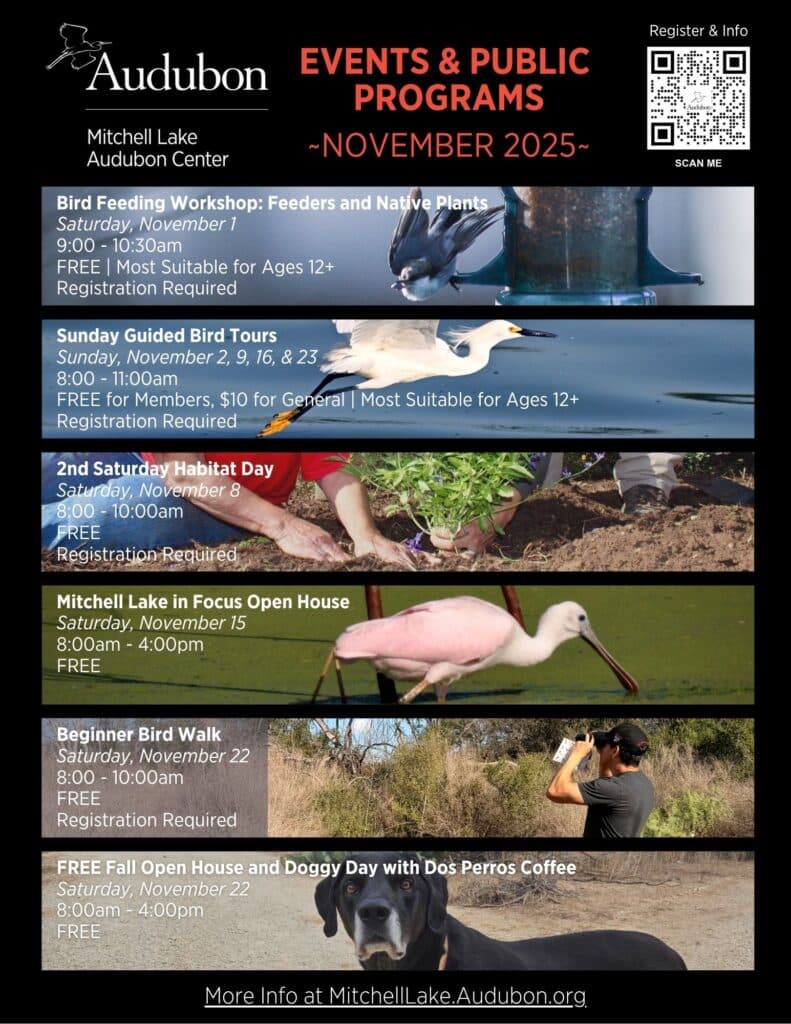 Unless otherwise noted, registration for all events and programs can be found at MitchellLake.Audubon.org/events