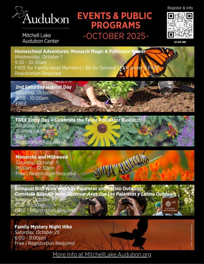 Mitchell Lake Audubon Center is welcoming fall with a full schedule of events designed to connect the community with nature. From homeschool classes and teacher open houses to bird walks, monarch workshops, and family night hikes, there is something for everyone to enjoy this October.