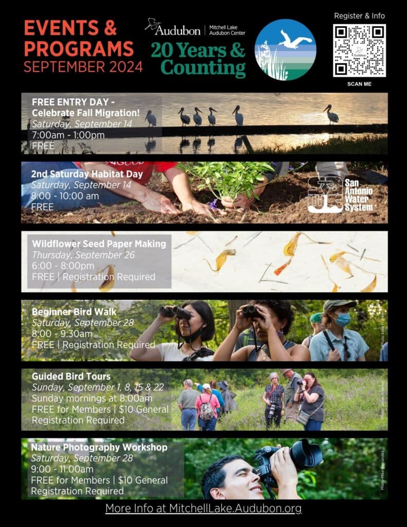 Get outside to celebrate fall migration and enjoy free entry all day at Mitchell Lake Audubon Center. Explore our gardens and trails and take home native plant educational material to learn what plants would best attract birds and pollinators to your space.