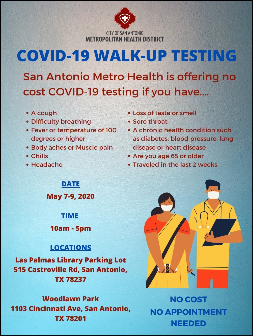Metro Health and San Antonio Fire Department’s Mobile Integrated Health Program (MIH) have partnered to bring the community free and accessible testing in underserved and minority communities. Two walk-up COVID-19 test sites, which do not require an appointment, will open May 7 – 9 at the Las Palmas Library parking lot and Woodlawn Lake Park.