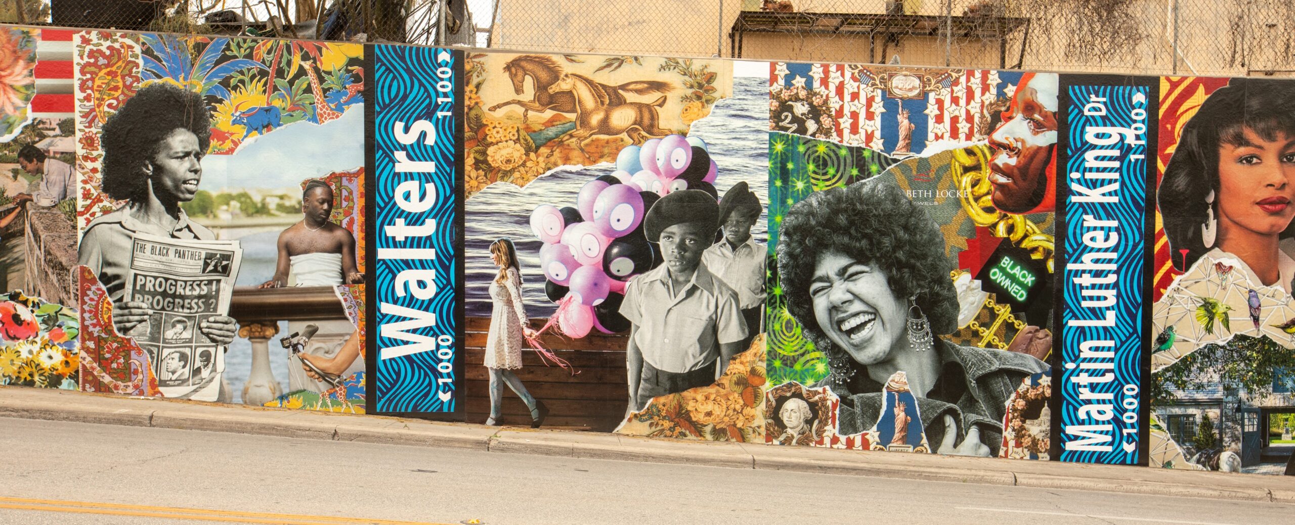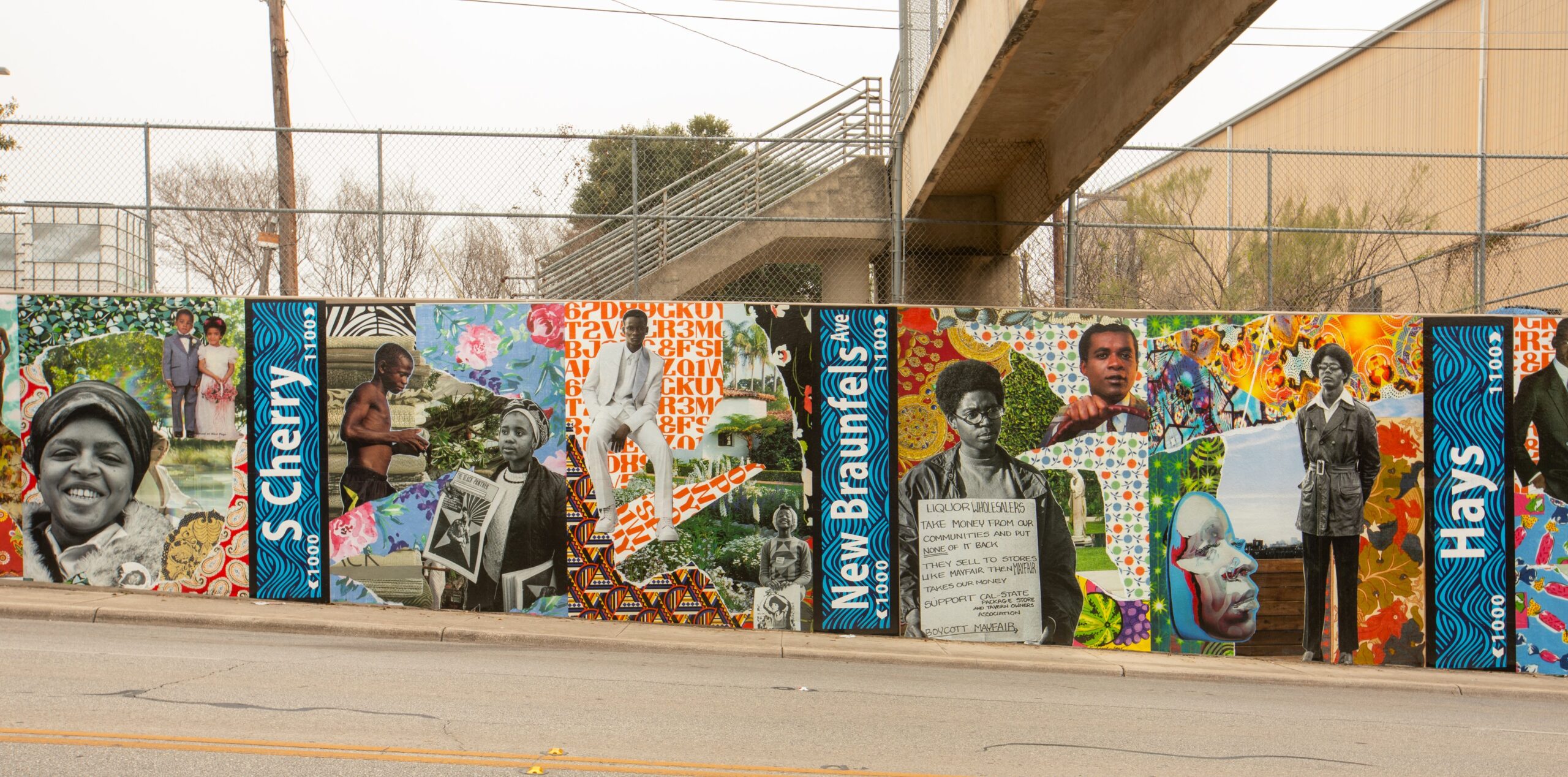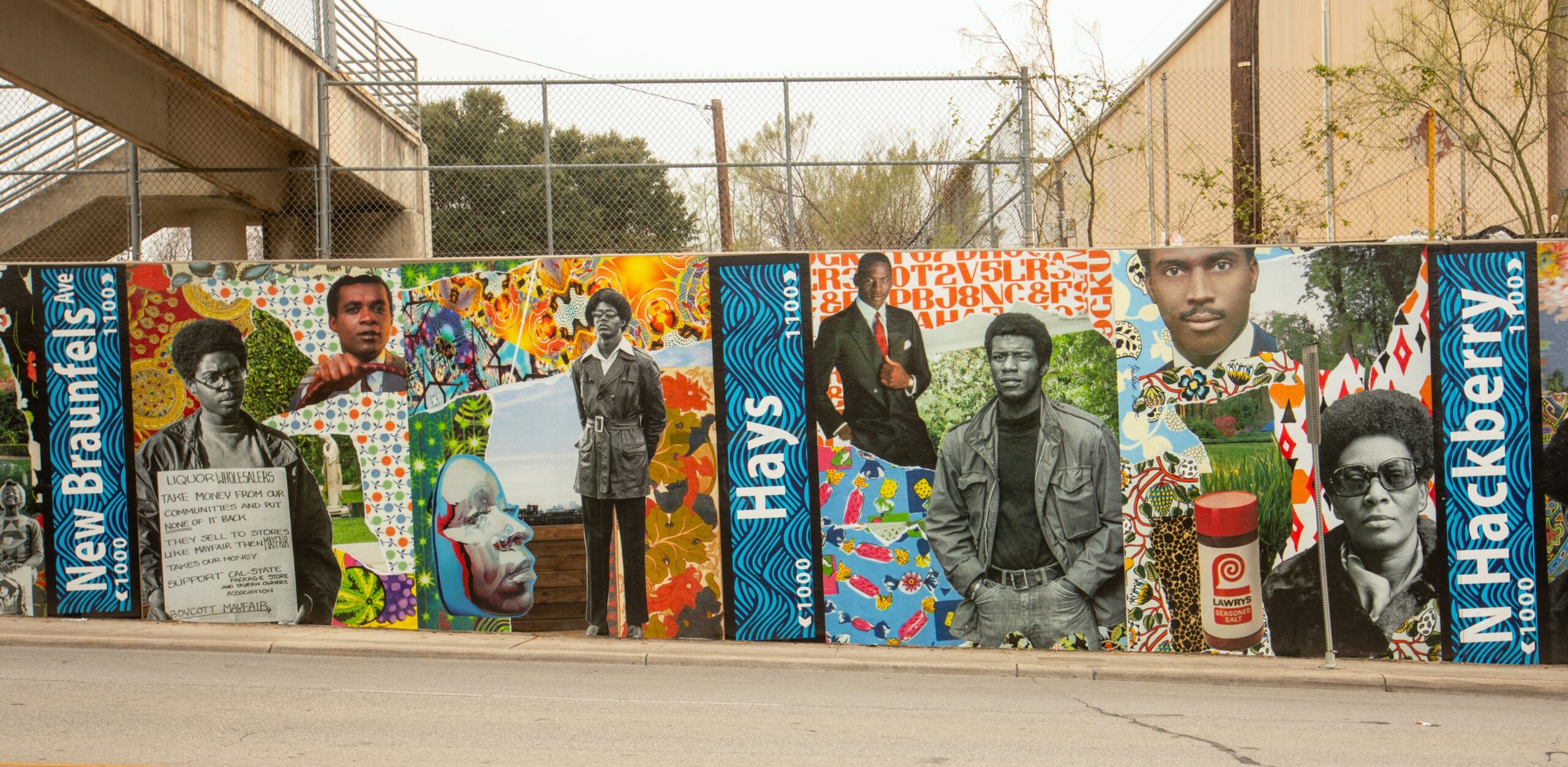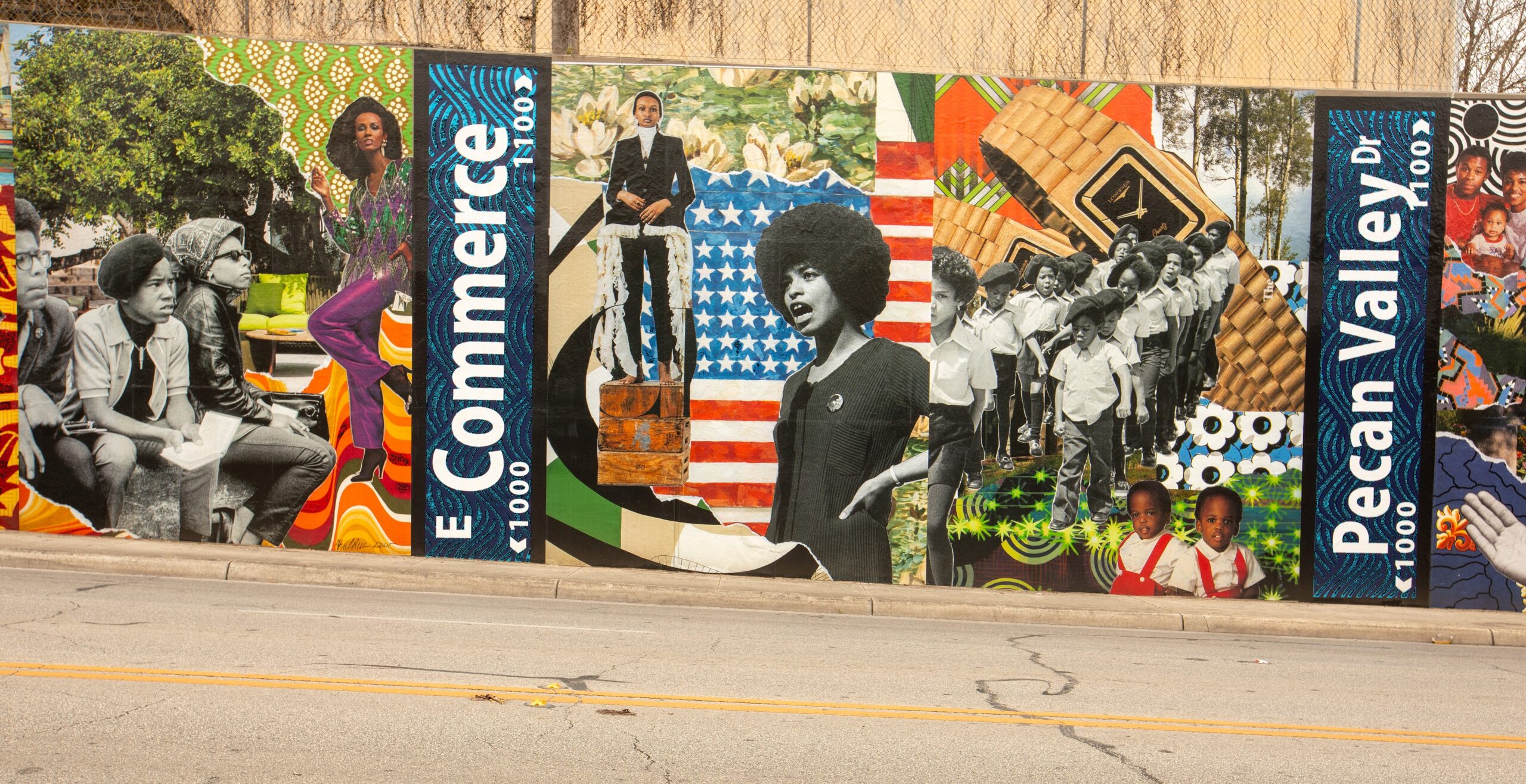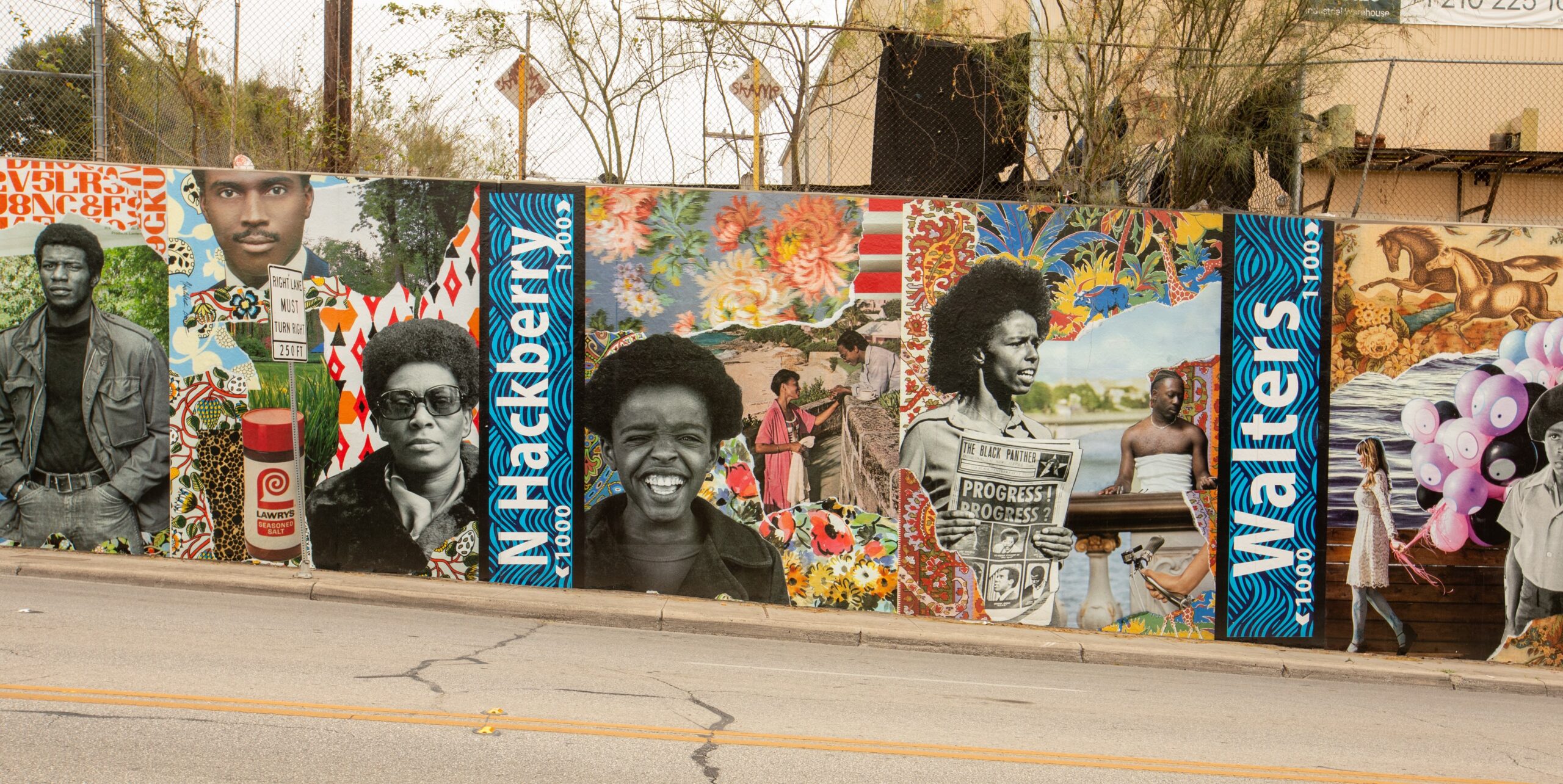 “Heirlooms: Eastside Pride” features layered, collaged imagery inspired by the 1960s and 1970s—an era defined by cultural pride, activism, and transformation within Black communities. The mural highlights fashion trends that shaped identity, references to historically significant street names, and expressive natural elements woven throughout vibrant patterns. Additionally, the Nolan Street mural San Antonio brings this period of activism to life with its powerful depictions.