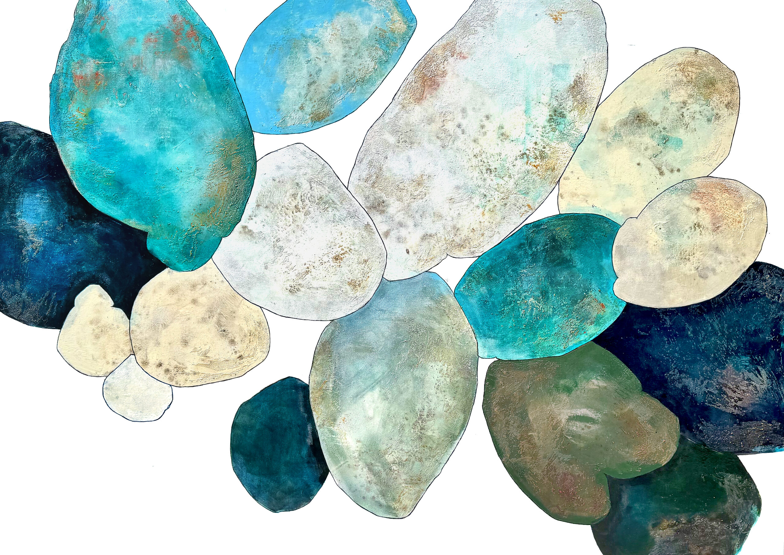 Meredith Pardue presents a luminous body of new large-scale paintings that fuse the grounded essence of minerals and gemstones with an airy, fleeting sense of breath. Her layered compositions transition from rich jewel tones to soft, opalescent veils of color, capturing and reflecting light with a subtle, living energy. These works feature intricate chromatic fields and textured, overlapping forms that expand visually beyond the canvas, inviting viewers into immersive, expansive environments.