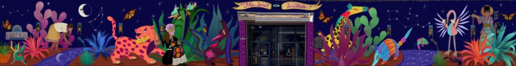 The theme and style of the artwork, which is bright, colorful and pays homage to the history of women and their work at Market Square, was determined through a series of community engagement sessions as part of the Department’s Public Art Process. The mural features women donning luchador masks, constellations and Alebrijes (brightly colored mythical creatures represented through Mexican folk-art sculptures which can be found throughout Market Square). Every element incorporated in the mural serves as a reminder that the location’s rich multicultural history is imbued with feminine connotation.