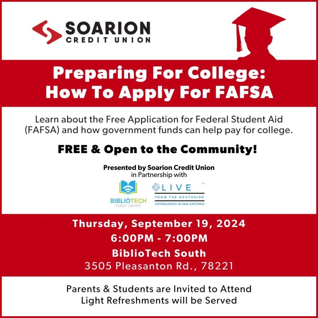 SOARION CREDIT UNION PRESENTS: PREPARING FOR COLLEGE – HOW TO APPLY FOR FAFSA – In Partnership with BiblioTech Public Library and Live from the Southside