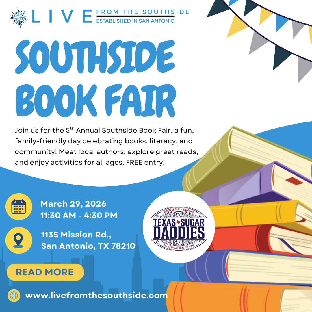 Get ready for a fun-filled day as the Southside Book Fair returns for its fifth year! Perfect for the whole family, this exciting event will feature captivating books, engaging activities, and the opportunity to meet amazing authors from the Southside and beyond. Mark your calendars for Sunday, March 29, 2025, from 11: 30 a.m. to 4: 30 p.m. This free event is open to everyone and will be held at the Texas Sugar Daddies Event Venue on the Por Vida Academy campus, 1135 Mission Road, San Antonio, TX 78210.