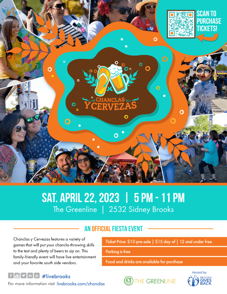 VIVA FIESTA! Join Chanclas y Cervezas for a family-friendly evening full of food, games, live music, and your favorite cervezas at The Greenline. The event occurs on Saturday, April 22, 2023, from 5 – 11 pm at The Greenline at 2532 Sidney Brooks Drive, San Antonio, TX 78235. Purchase tickets at https://bit.ly/3nCsS5V.