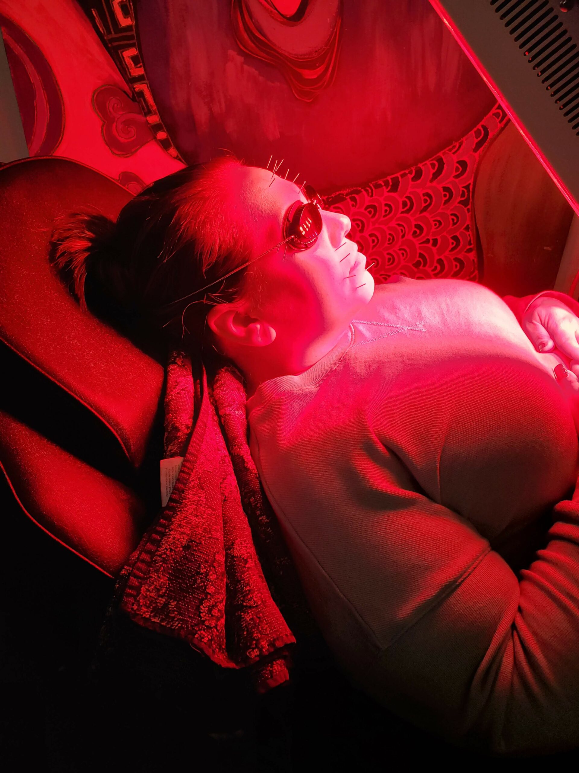 After all the needles are placed on your face, you’ll lay down on a table under the LED lamp. If you’re not familiar with what LED light does to your skin, it also stimulates collagen production and improves circulation to the face. You’re under the lamp for about 20 minutes and after your time is up, Dr. Gans removes all the needles and has you apply moisturizer on your face.