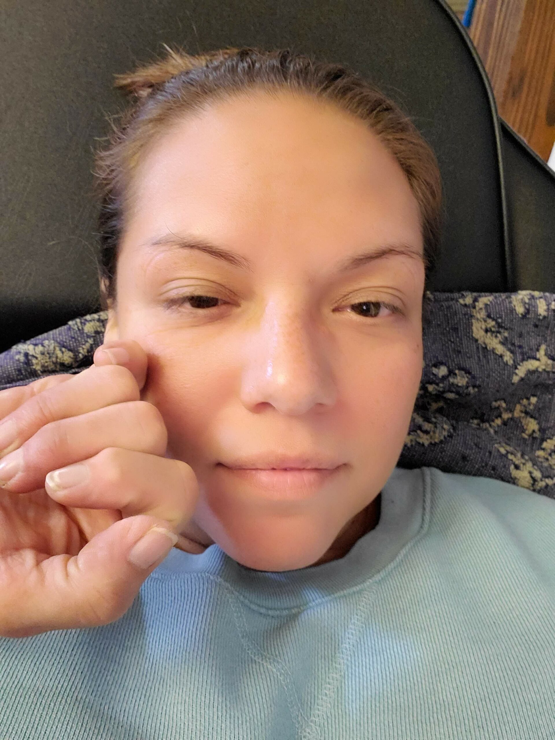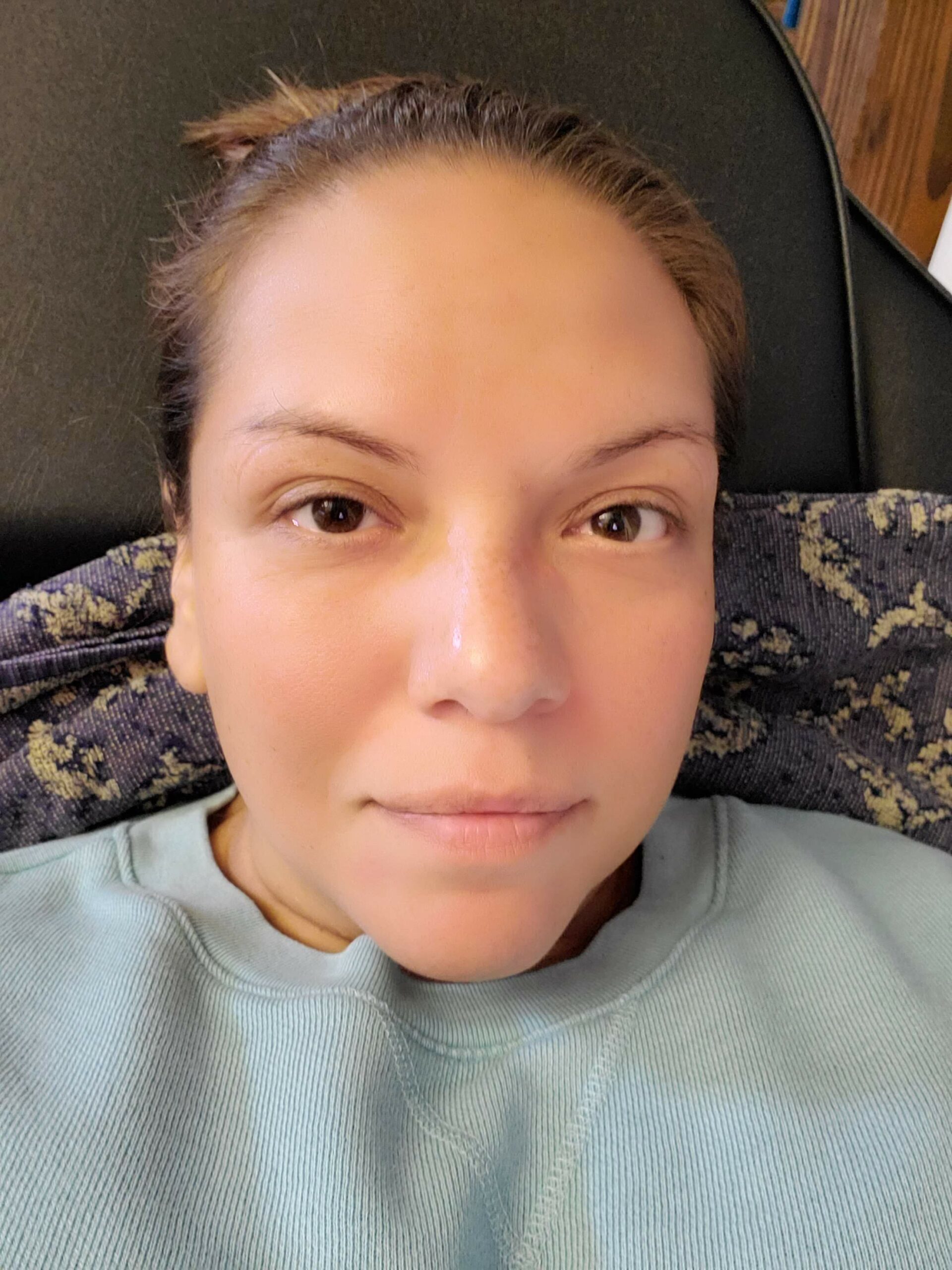 After the treatment was over, we didn’t notice any markings on our faces where the needles were placed or any redness. We did notice a smoother forehead frown wrinkle and a bit of lifting in our cheeks.