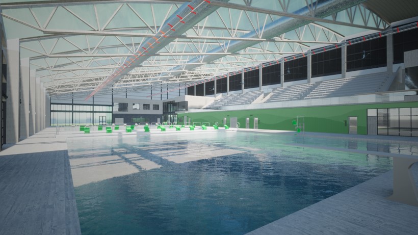 The two-story aquatic center will feature a 50-meter competition pool with a diving board and a 25-yard instructional warmup pool. The first floor will include restrooms, lockers, showers, a weight room, and a multipurpose classroom. The second floor will consist of spectator seating, offices, and concessions.