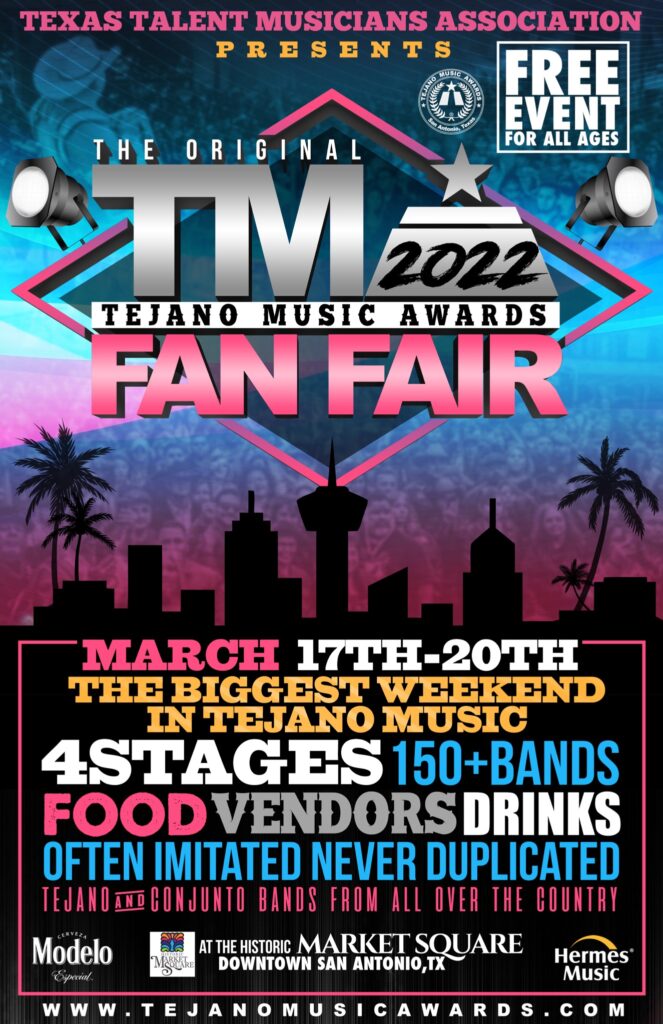 TMA FANFAIR 2022 WEEKEND, FRIDAY-SUNDAY, March 17-20,2022 AT MARKET SQUARE: WHAT: Tejano Music Awards FanFair 2022: Four days of FREE live Tejano music on four stages WHEN: FREE ADMISSION; 12 Noon – 11:00 pm, Friday-Sunday, March 17-20, 2022 WHERE: Historic Market Square in downtown San Antonio, Texas