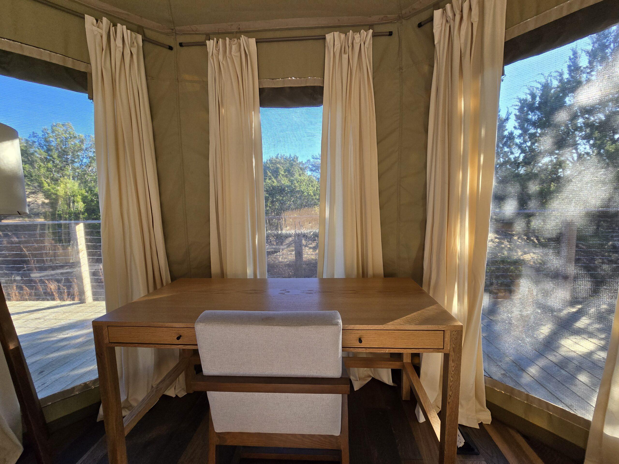 Luxury Glamping at Outdoorsy Texas Hill Country seamlessly blends productivity and relaxation for busy professionals like us. Each tent is equipped with high-speed Wi-Fi, a dedicated workstation, and a wrap-around deck, making it easy to balance work with moments of mindfulness.