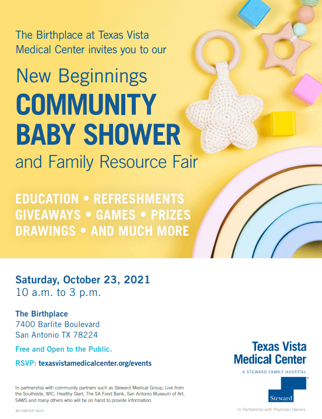Calling all soon-to-be moms, new moms, and their families! The Birthplace at Texas Vista Medical Center, a Steward family hospital, is hosting the New Beginnings Community Baby Shower and Family Resource Fair on Saturday, October 23, 2021, from 10 a.m. – 3 p.m. In partnership with various community organizations, expectant mothers and their families are invited to a day of games, activities, giveaways, prizes, refreshments, and education – all at no cost.