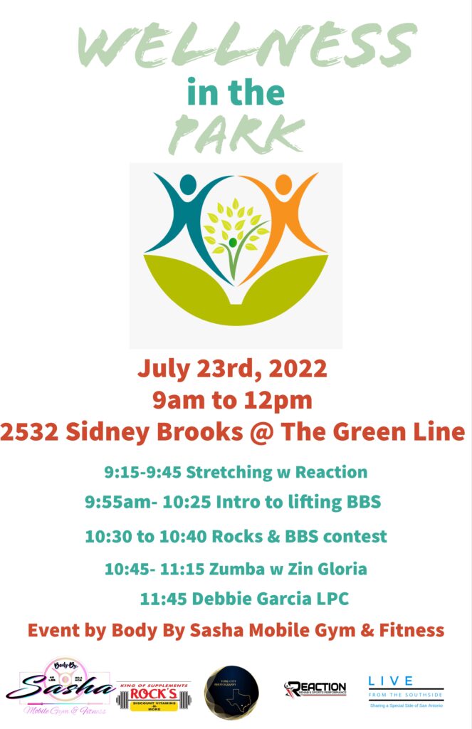 Join the community for this one of kind event! Hosted by Body by Sasha Mobile Gym & Fitness, Wellness in the Park is a FREE community event to promote healthy lifestyles and support surrounding small businesses in the health and wellness industry. The event is on July 23, 2022 and will be from 9am – 12pm at The Greenline on the Brooks campus located at 2532 Sidney Brooks, San Antonio, TX 78235. The event will feature local wellness vendors and community groups San Antonio Lady Riders, Tone City Photography, Zumba with Zin Gloria, Morph.TheLabel, and others.