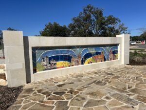 Jacob Tobar’s sculptural installation, “Bent Will,” serves as the physical entrance to the trail and symbolizes San Antonio’s oldest homes, resilience, and enduring roots. Meanwhile, Buentello’s tile mural, “Entretejiendo Historias” (Weaving Stories), draws inspiration from early historical images of the city’s four missions—Mission Concepción, Mission San José, Mission San Juan, and Mission Espada—depicting how they once appeared and honoring the stories woven through generations.