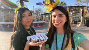 Our trip started with a nice walk, during which we admired the bright decor arranged around the park. We then arrived at their ‘Rockville High School’ to see an impressive display of seasonal food and merchandise. We also had the opportunity to interview the Regional Manager of Media and Public Relations, Cyle Perez. During the interview, we asked about the new entertainment Mardi Gras had to offer, for which he stated, “Mardi Gras has all new entertainment, which is so exciting. Right now, we’re standing in front of the voodoo dolls, which won the best show award internationally from any theme park in the world, and it’s incredible to have them right here in San Antonio. But we have a lot of fun shows you can check out”. We also asked about his favorite Mardi Gras snack and favorite show to watch. He stated, “I love voodoo dolls. They’re award winners. Of course. But I would say dance parade because it is so much fun – there’s acrobatics in it, there’s silks, it’s a lot of fun. And we have all that in front of the park. Regarding food, it has to be the Cajun-loaded fry. I am a sucker for French fries, and these are absolutely delicious – I recommend trying”. Later, we took selfies with the Park Manager, Robert Bustle.